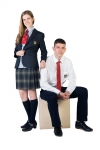 Formal wear for boys and girls - classic jacket with lapels, shirt trousers, plaid skirt with pleats, tie, short tie for girls, 3/4 socks