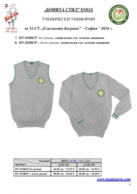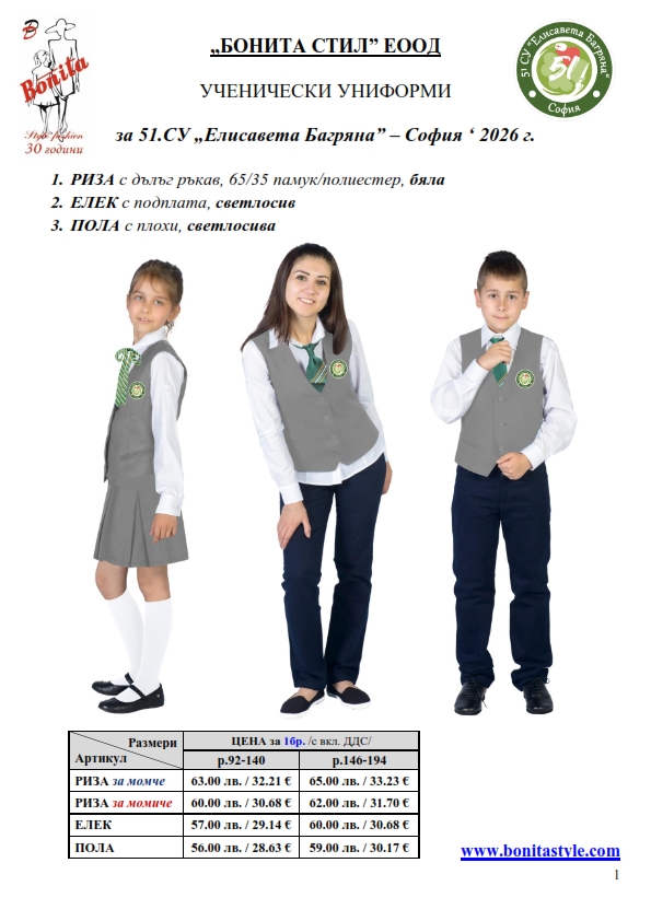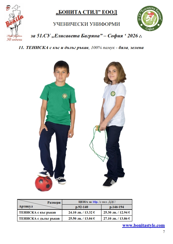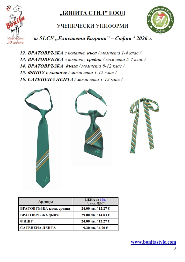 7. Гаранционни условия: “БОНИТА СТИЛ” е сертифицирана и прилага система за управление на качеството ISO 9001:2015. В съответствие с изискванията на тази система и прилаганите процедури, "БОНИТА СТИЛ" гарантира, че всички произведени от фирмата продукти отговарят на изискванията на БДС и Европейските стандарти за безопасност и качество на стоките и услугите. Всички предлагани тук артикули за ученически униформи са с гаранционен срок в рамките на шест месеца. Действието на тази гаранция се простира върху всички използвани материали при установени фабрични дефекти, както и върху качеството на изработка на артикулите, при спазени всички предписани от производителя изисквания по отношение на третиране и съхранение на облеклата. Гаранцията не отнася за механични и химични увреждания на тъканите, причинени от Клиента при употреба и третиране.