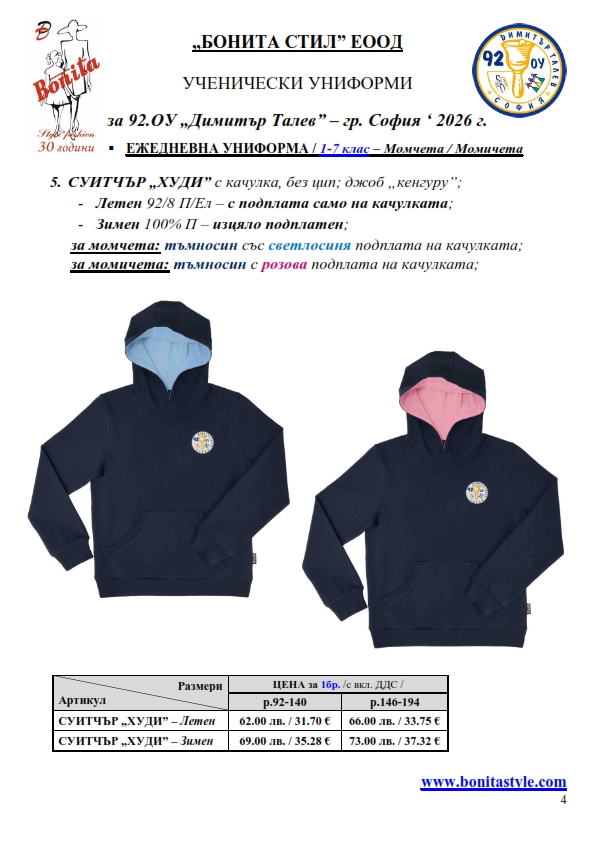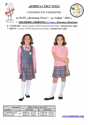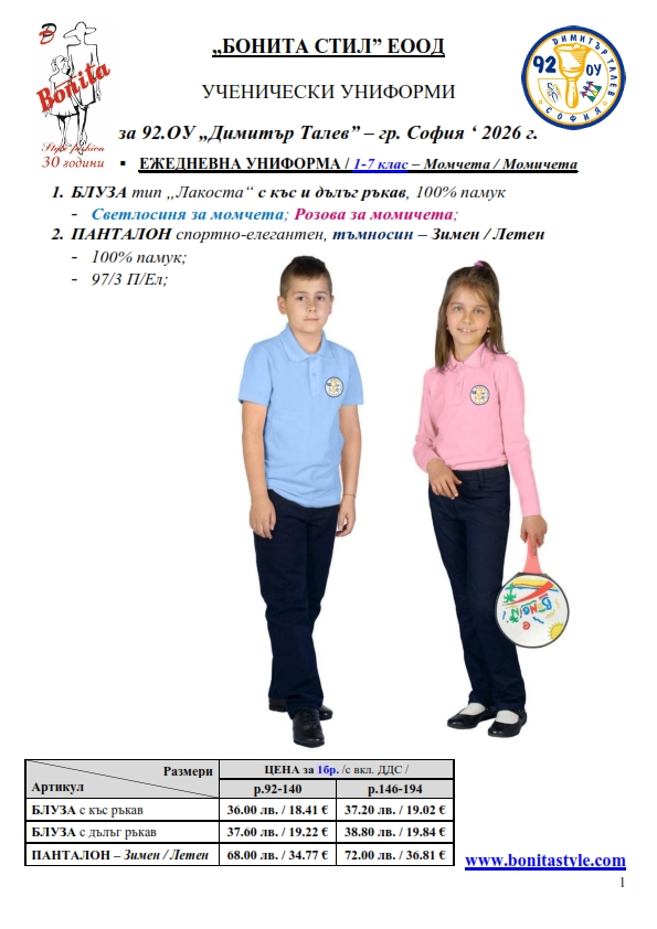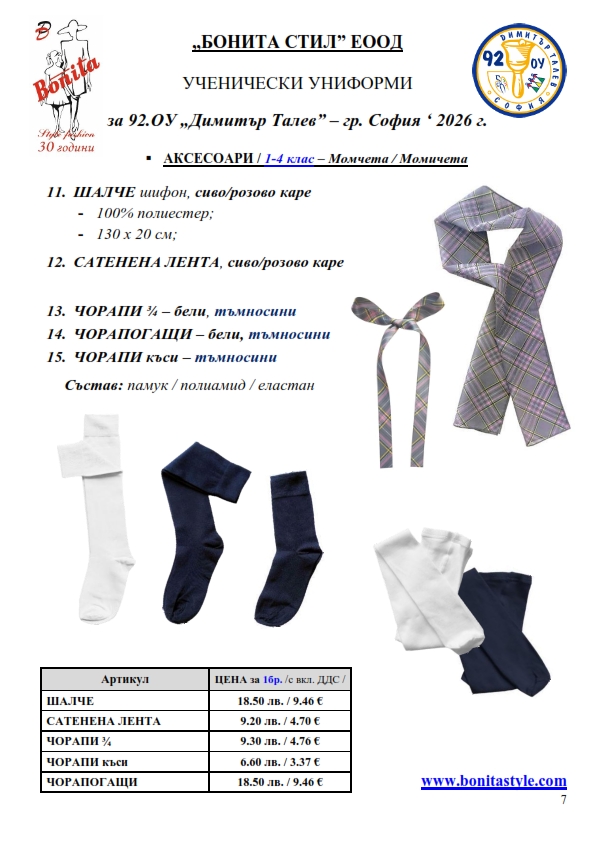 7. Гаранционни условия: “БОНИТА СТИЛ” е сертифицирана и прилага система за управление на качеството ISO 9001:2015. В съответствие с изискванията на тази система и прилаганите процедури, "БОНИТА СТИЛ" гарантира, че всички произведени от фирмата продукти отговарят на изискванията на БДС и Европейските стандарти за безопасност и качество на стоките и услугите. Всички предлагани тук артикули за ученически униформи са с гаранционен срок в рамките на шест месеца. Действието на тази гаранция се простира върху всички използвани материали при установени фабрични дефекти, както и върху качеството на изработка на артикулите, при спазени всички предписани от производителя изисквания по отношение на третиране и съхранение на облеклата. Гаранцията не отнася за механични и химични увреждания на тъканите, причинени от Клиента при употреба и третиране.