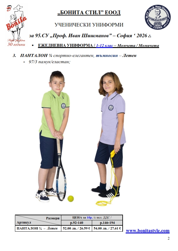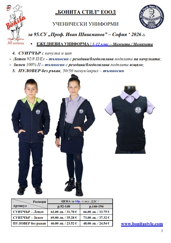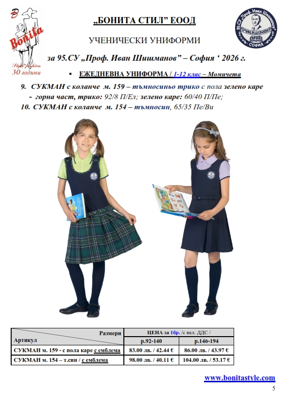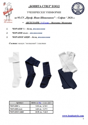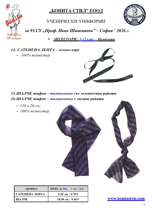 7. Гаранционни условия: “БОНИТА СТИЛ” е сертифицирана и прилага система за управление на качеството ISO 9001:2015. В съответствие с изискванията на тази система и прилаганите процедури, "БОНИТА СТИЛ" гарантира, че всички произведени от фирмата продукти отговарят на изискванията на БДС и Европейските стандарти за безопасност и качество на стоките и услугите. Всички предлагани тук артикули за ученически униформи са с гаранционен срок в рамките на шест месеца. Действието на тази гаранция се простира върху всички използвани материали при установени фабрични дефекти, както и върху качеството на изработка на артикулите, при спазени всички предписани от производителя изисквания по отношение на третиране и съхранение на облеклата. Гаранцията не отнася за механични и химични увреждания на тъканите, причинени от Клиента при употреба и третиране.