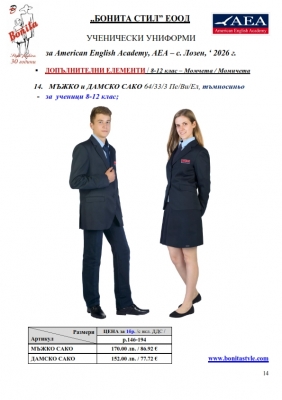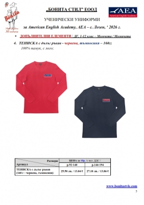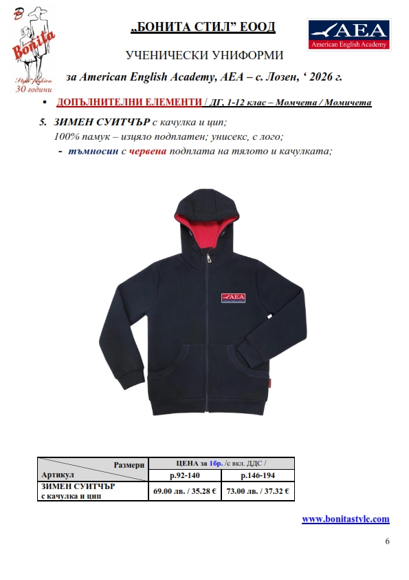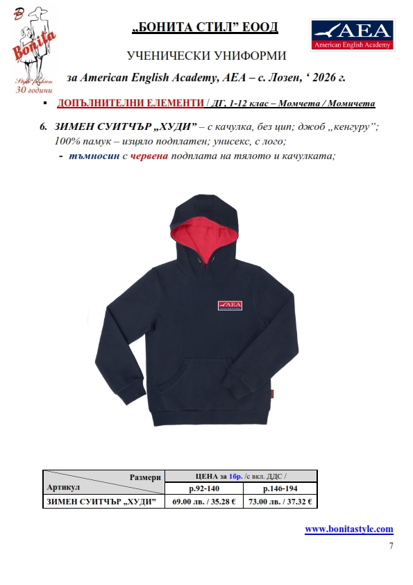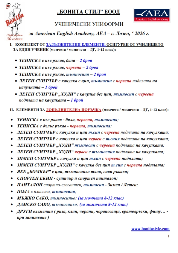 7. Гаранционни условия: “БОНИТА СТИЛ” е сертифицирана и прилага система за управление на качеството ISO 9001:2015. В съответствие с изискванията на тази система и прилаганите процедури, "БОНИТА СТИЛ" гарантира, че всички произведени от фирмата продукти отговарят на изискванията на БДС и Европейските стандарти за безопасност и качество на стоките и услугите. Всички предлагани тук артикули за ученически униформи са с гаранционен срок в рамките на шест месеца. Действието на тази гаранция се простира върху всички използвани материали при установени фабрични дефекти, както и върху качеството на изработка на артикулите, при спазени всички предписани от производителя изисквания по отношение на третиране и съхранение на облеклата. Гаранцията не отнася за механични и химични увреждания на тъканите, причинени от Клиента при употреба и третиране.