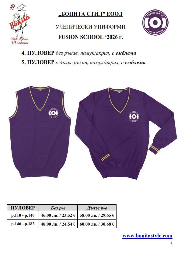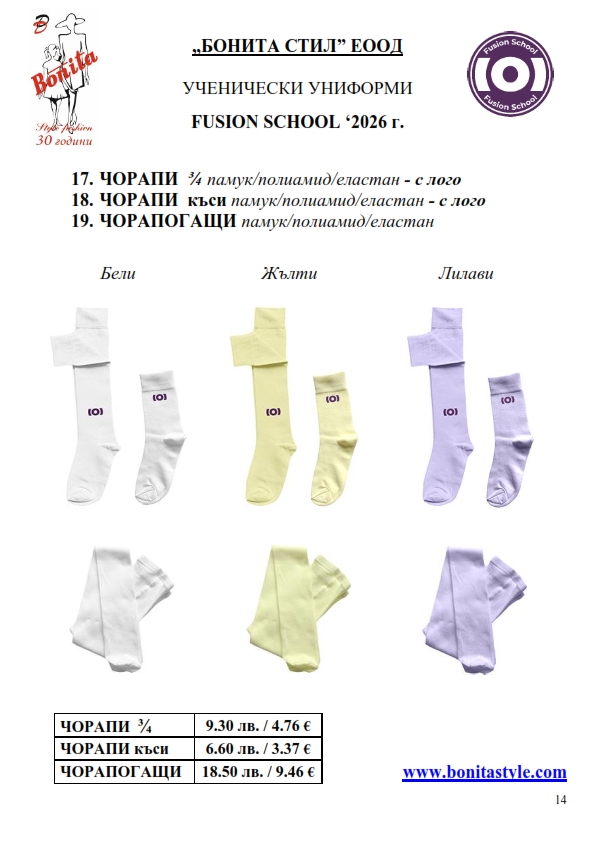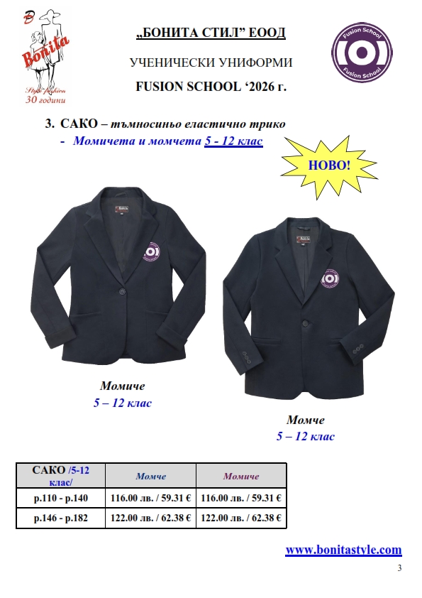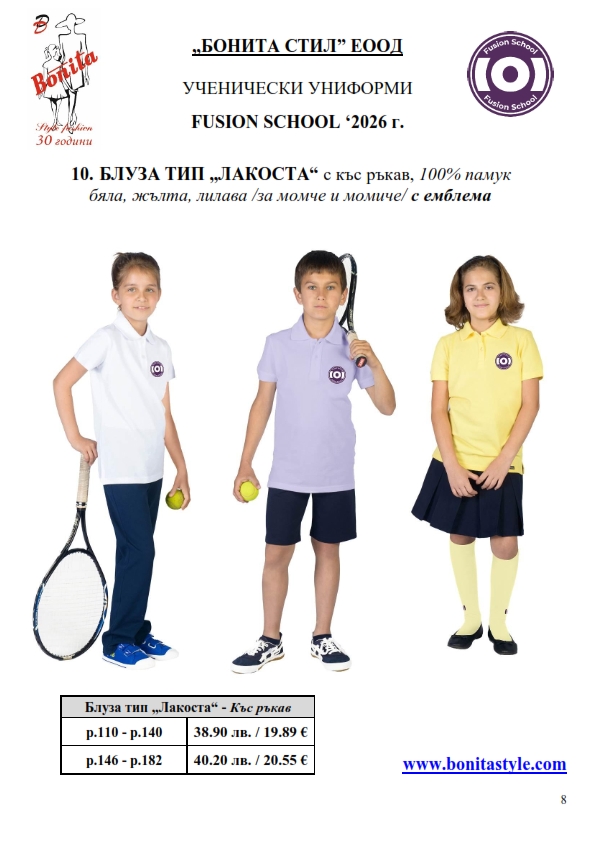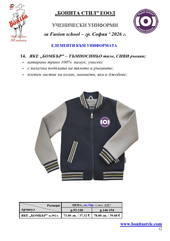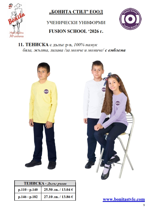 7. Гаранционни условия: “БОНИТА СТИЛ” е сертифицирана и прилага система за управление на качеството ISO 9001:2015. В съответствие с изискванията на тази система и прилаганите процедури, "БОНИТА СТИЛ" гарантира, че всички произведени от фирмата продукти отговарят на изискванията на БДС и Европейските стандарти за безопасност и качество на стоките и услугите. Всички предлагани тук артикули за ученически униформи са с гаранционен срок в рамките на шест месеца. Действието на тази гаранция се простира върху всички използвани материали при установени фабрични дефекти, както и върху качеството на изработка на артикулите, при спазени всички предписани от производителя изисквания по отношение на третиране и съхранение на облеклата. Гаранцията не отнася за механични и химични увреждания на тъканите, причинени от Клиента при употреба и третиране.