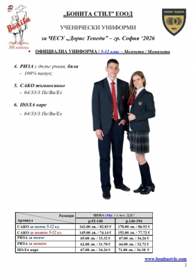 2. Единичните цени по артикули са калкулирани за договорените с училището основни материали. В случай, че Клиентът желае промяна на предвидените модели, както и на посочените в офертата материали, цените се предоговарят;