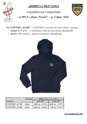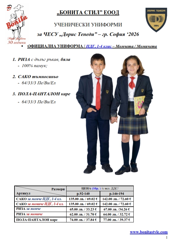 7. Гаранционни условия: “БОНИТА СТИЛ” е сертифицирана и прилага система за управление на качеството ISO 9001:2015. В съответствие с изискванията на тази система и прилаганите процедури, "БОНИТА СТИЛ" гарантира, че всички произведени от фирмата продукти отговарят на изискванията на БДС и Европейските стандарти за безопасност и качество на стоките и услугите. Всички предлагани тук артикули за ученически униформи са с гаранционен срок в рамките на шест месеца. Действието на тази гаранция се простира върху всички използвани материали при установени фабрични дефекти, както и върху качеството на изработка на артикулите, при спазени всички предписани от производителя изисквания по отношение на третиране и съхранение на облеклата. Гаранцията не отнася за механични и химични увреждания на тъканите, причинени от Клиента при употреба и третиране.