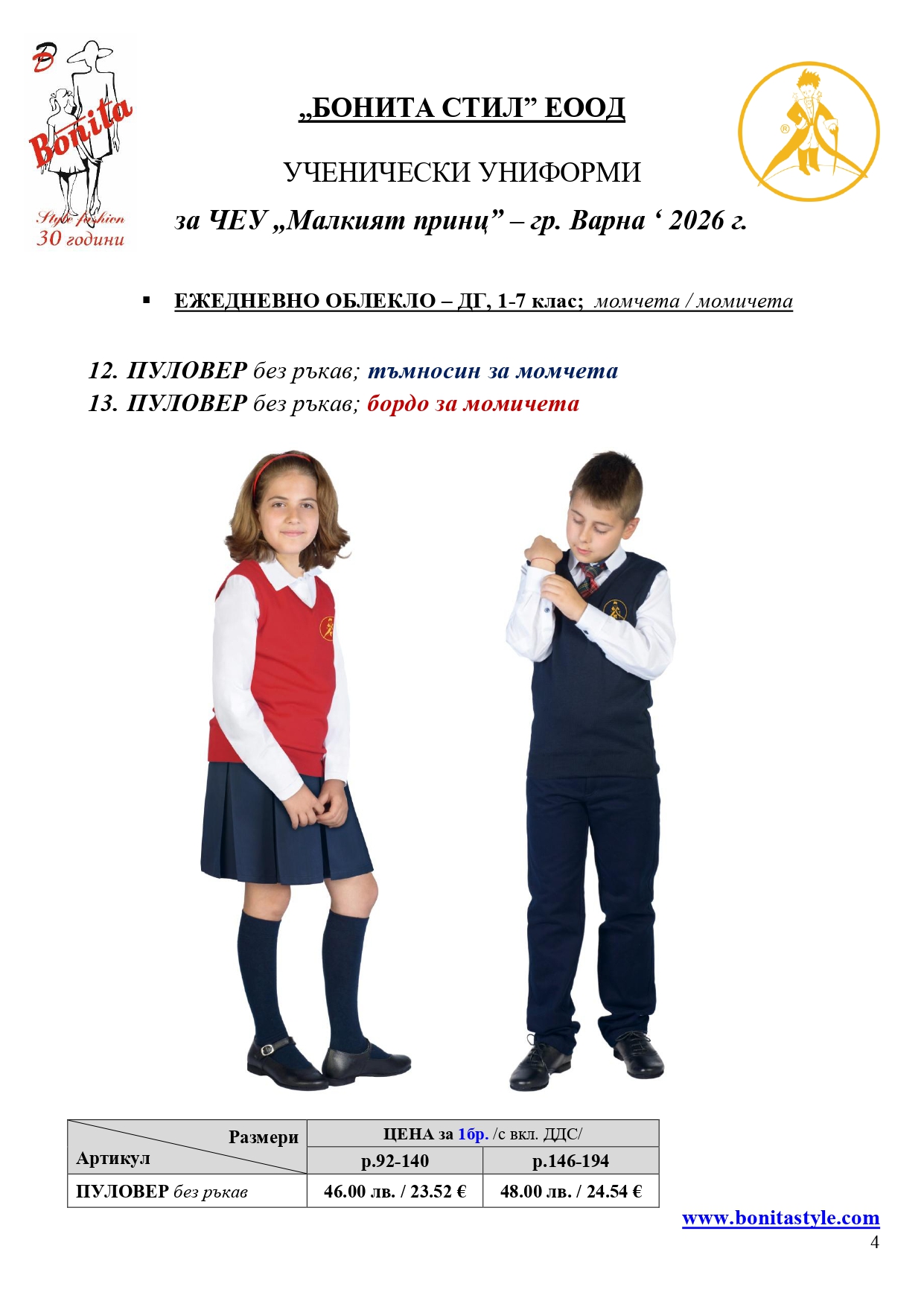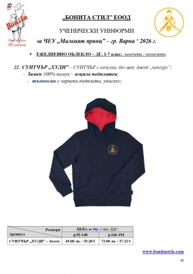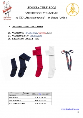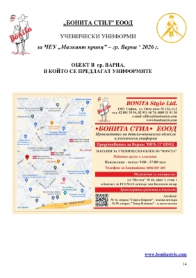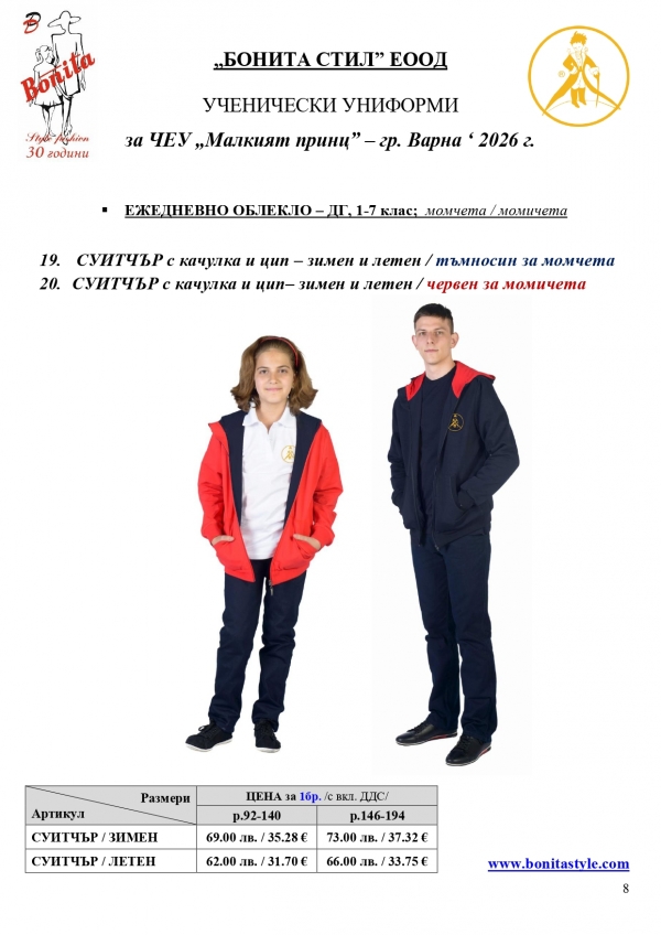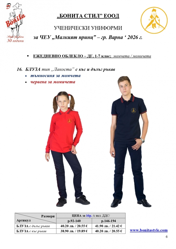 7. Гаранционни условия: “БОНИТА СТИЛ” е сертифицирана и прилага система за управление на качеството ISO 9001:2015. В съответствие с изискванията на тази система и прилаганите процедури, "БОНИТА СТИЛ" гарантира, че всички произведени от фирмата продукти отговарят на изискванията на БДС и Европейските стандарти за безопасност и качество на стоките и услугите. Всички предлагани тук артикули за ученически униформи са с гаранционен срок в рамките на шест месеца. Действието на тази гаранция се простира върху всички използвани материали при установени фабрични дефекти, както и върху качеството на изработка на артикулите, при спазени всички предписани от производителя изисквания по отношение на третиране и съхранение на облеклата. Гаранцията не отнася за механични и химични увреждания на тъканите, причинени от Клиента при употреба и третиране.