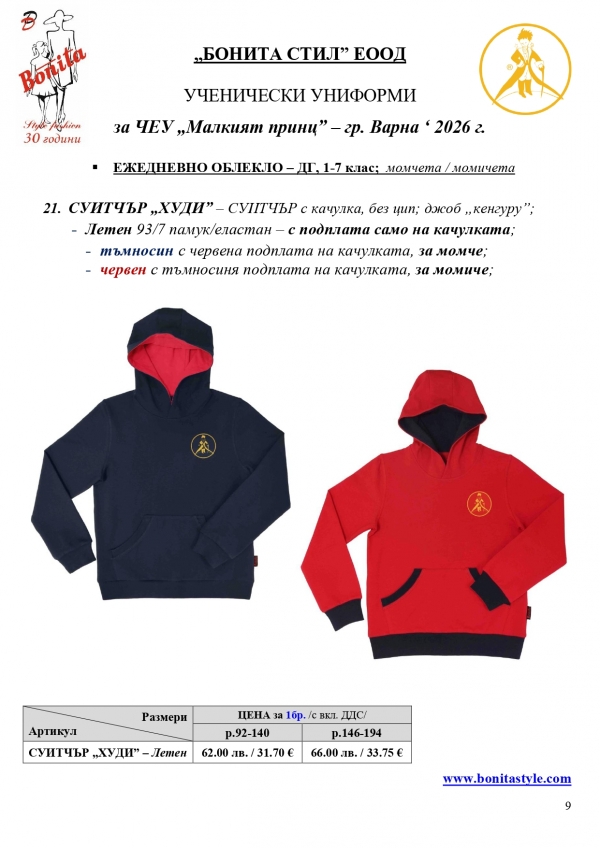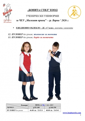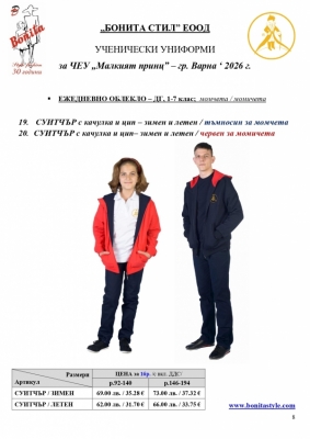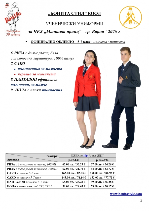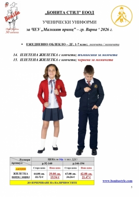 2. Единичните цени по артикули са калкулирани за договорените с училището основни материали. В случай, че Клиентът желае промяна на предвидените модели, както и на посочените в офертата материали, цените се предоговарят;