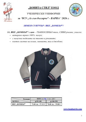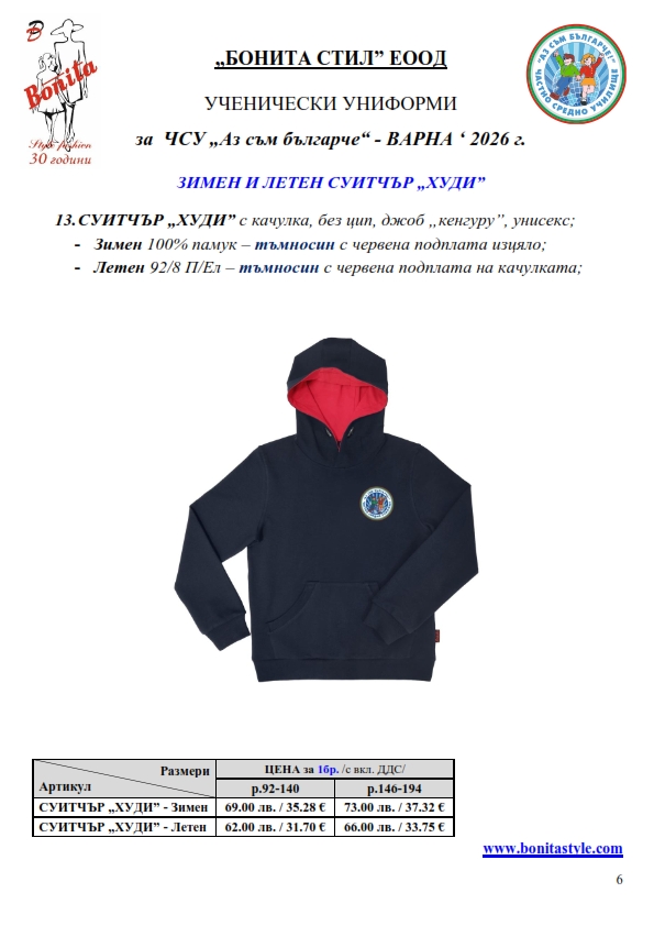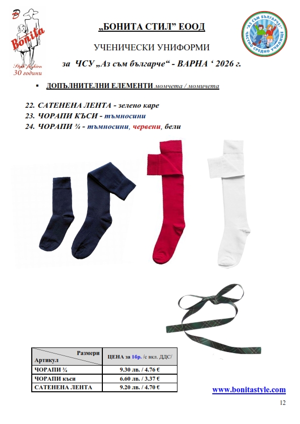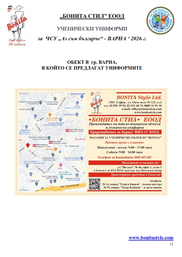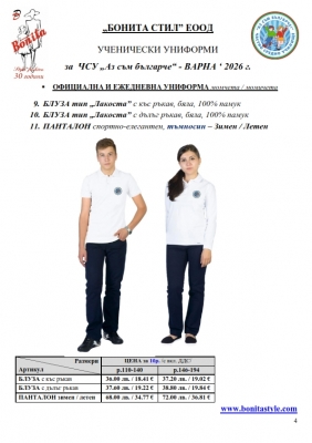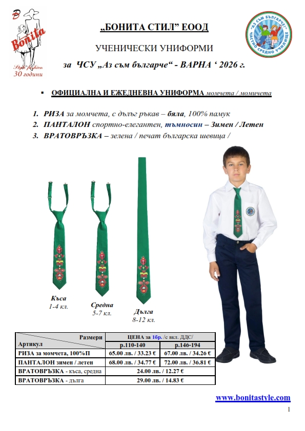 7. Гаранционни условия: “БОНИТА СТИЛ” е сертифицирана и прилага система за управление на качеството ISO 9001:2015. В съответствие с изискванията на тази система и прилаганите процедури, "БОНИТА СТИЛ" гарантира, че всички произведени от фирмата продукти отговарят на изискванията на БДС и Европейските стандарти за безопасност и качество на стоките и услугите. Всички предлагани тук артикули за ученически униформи са с гаранционен срок в рамките на шест месеца. Действието на тази гаранция се простира върху всички използвани материали при установени фабрични дефекти, както и върху качеството на изработка на артикулите, при спазени всички предписани от производителя изисквания по отношение на третиране и съхранение на облеклата. Гаранцията не отнася за механични и химични увреждания на тъканите, причинени от Клиента при употреба и третиране.