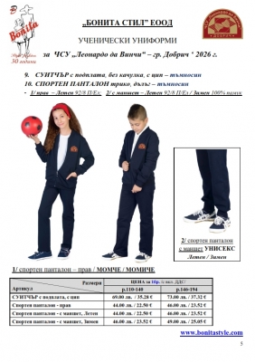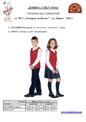 2. Единичните цени по артикули са калкулирани за договорените с училището основни материали. В случай, че Клиентът желае промяна на предвидените модели, както и на посочените в офертата материали, цените се предоговарят;