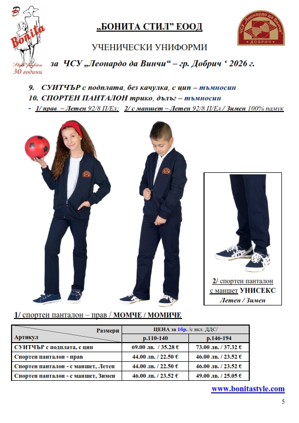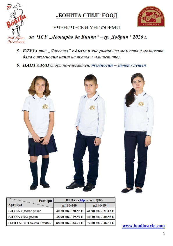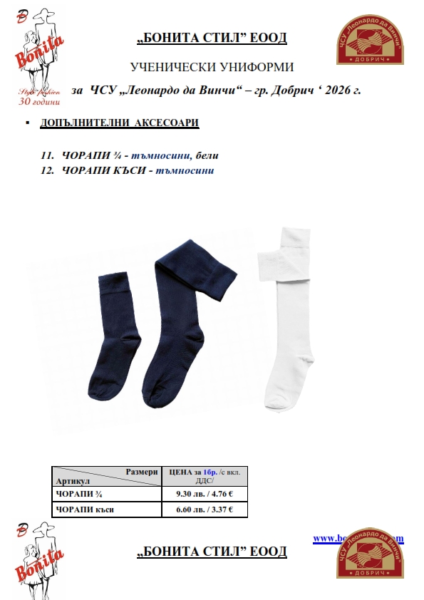7. Гаранционни условия: “БОНИТА СТИЛ” е сертифицирана и прилага система за управление на качеството ISO 9001:2015. В съответствие с изискванията на тази система и прилаганите процедури, "БОНИТА СТИЛ" гарантира, че всички произведени от фирмата продукти отговарят на изискванията на БДС и Европейските стандарти за безопасност и качество на стоките и услугите. Всички предлагани тук артикули за ученически униформи са с гаранционен срок в рамките на шест месеца. Действието на тази гаранция се простира върху всички използвани материали при установени фабрични дефекти, както и върху качеството на изработка на артикулите, при спазени всички предписани от производителя изисквания по отношение на третиране и съхранение на облеклата. Гаранцията не отнася за механични и химични увреждания на тъканите, причинени от Клиента при употреба и третиране.