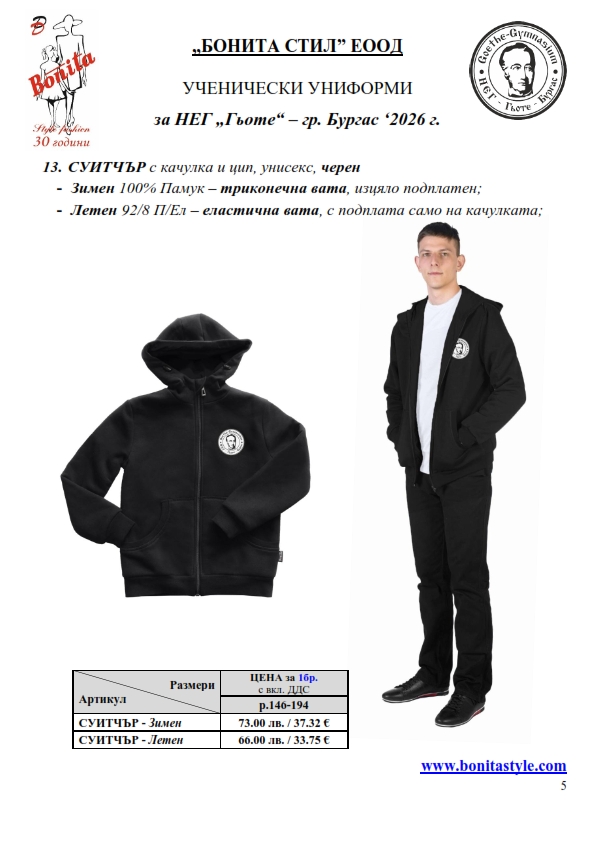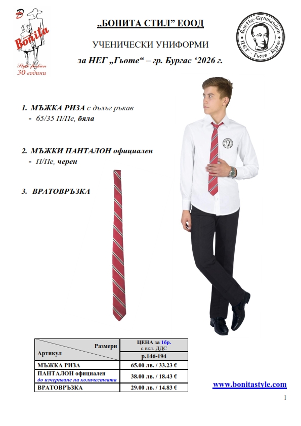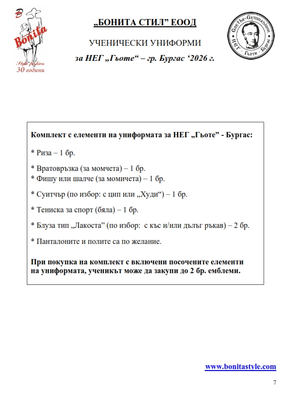 7. Гаранционни условия: “БОНИТА СТИЛ” е сертифицирана и прилага система за управление на качеството ISO 9001:2015. В съответствие с изискванията на тази система и прилаганите процедури, "БОНИТА СТИЛ" гарантира, че всички произведени от фирмата продукти отговарят на изискванията на БДС и Европейските стандарти за безопасност и качество на стоките и услугите. Всички предлагани тук артикули за ученически униформи са с гаранционен срок в рамките на шест месеца. Действието на тази гаранция се простира върху всички използвани материали при установени фабрични дефекти, както и върху качеството на изработка на артикулите, при спазени всички предписани от производителя изисквания по отношение на третиране и съхранение на облеклата. Гаранцията не отнася за механични и химични увреждания на тъканите, причинени от Клиента при употреба и третиране.