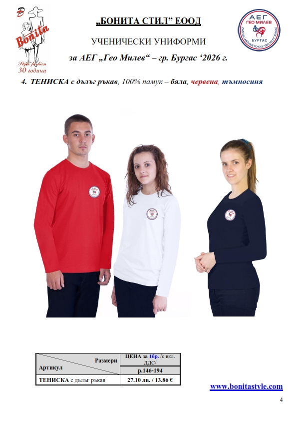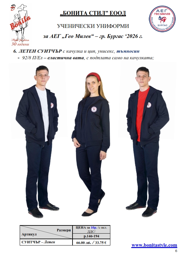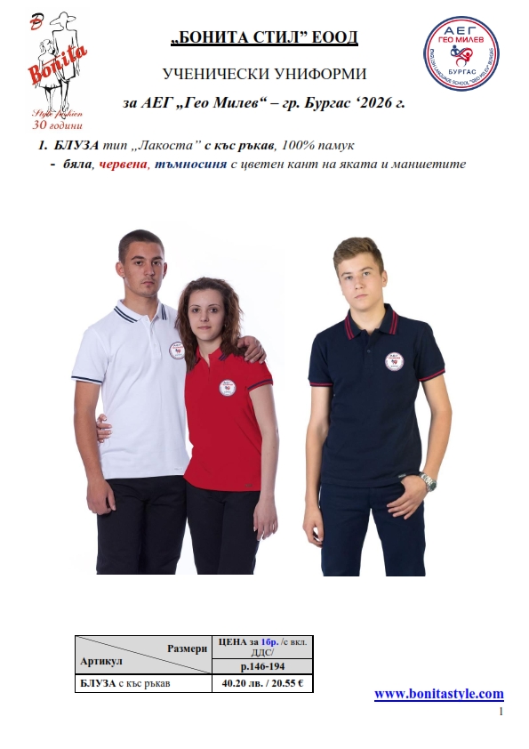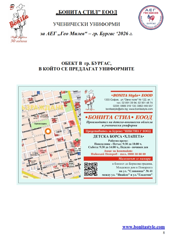 7. Гаранционни условия: “БОНИТА СТИЛ” е сертифицирана и прилага система за управление на качеството ISO 9001:2015. В съответствие с изискванията на тази система и прилаганите процедури, "БОНИТА СТИЛ" гарантира, че всички произведени от фирмата продукти отговарят на изискванията на БДС и Европейските стандарти за безопасност и качество на стоките и услугите. Всички предлагани тук артикули за ученически униформи са с гаранционен срок в рамките на шест месеца. Действието на тази гаранция се простира върху всички използвани материали при установени фабрични дефекти, както и върху качеството на изработка на артикулите, при спазени всички предписани от производителя изисквания по отношение на третиране и съхранение на облеклата. Гаранцията не отнася за механични и химични увреждания на тъканите, причинени от Клиента при употреба и третиране.