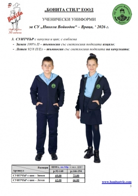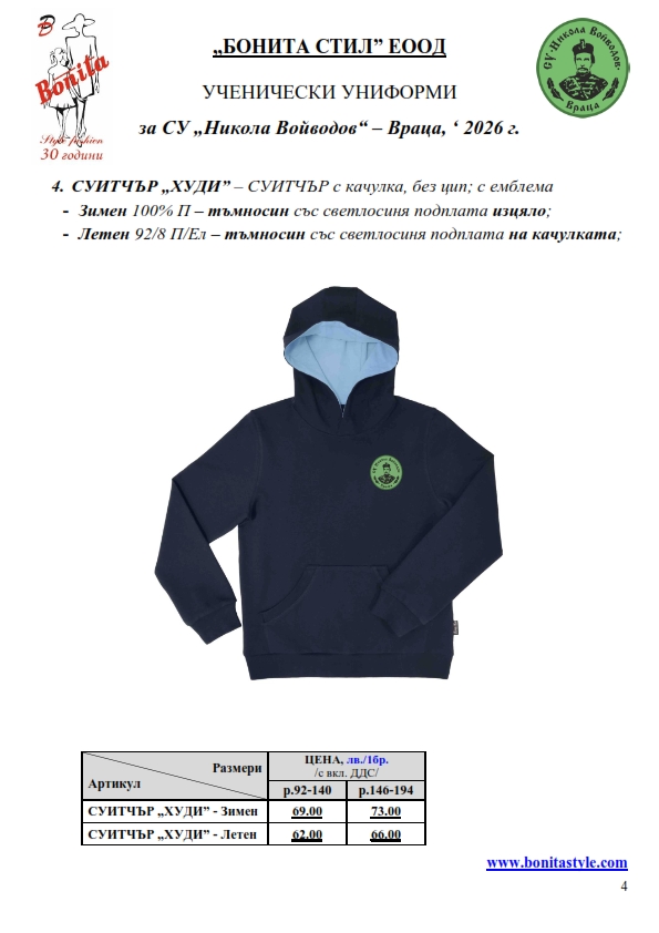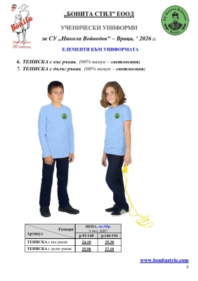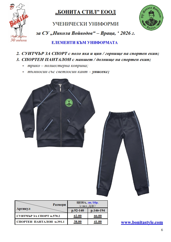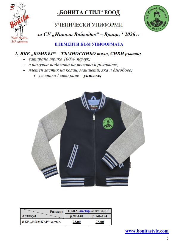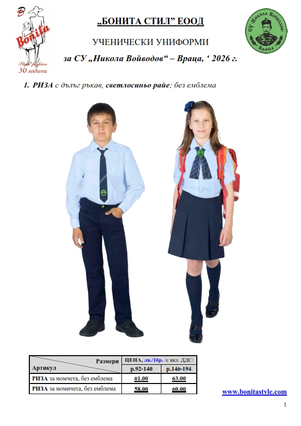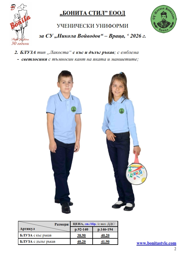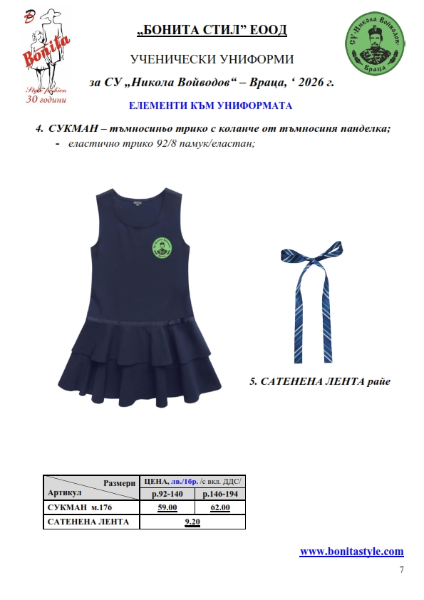 7. Гаранционни условия: “БОНИТА СТИЛ” е сертифицирана и прилага система за управление на качеството ISO 9001:2015. В съответствие с изискванията на тази система и прилаганите процедури, "БОНИТА СТИЛ" гарантира, че всички произведени от фирмата продукти отговарят на изискванията на БДС и Европейските стандарти за безопасност и качество на стоките и услугите. Всички предлагани тук артикули за ученически униформи са с гаранционен срок в рамките на шест месеца. Действието на тази гаранция се простира върху всички използвани материали при установени фабрични дефекти, както и върху качеството на изработка на артикулите, при спазени всички предписани от производителя изисквания по отношение на третиране и съхранение на облеклата. Гаранцията не отнася за механични и химични увреждания на тъканите, причинени от Клиента при употреба и третиране.