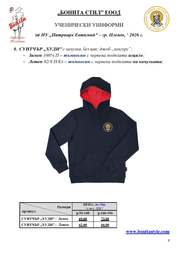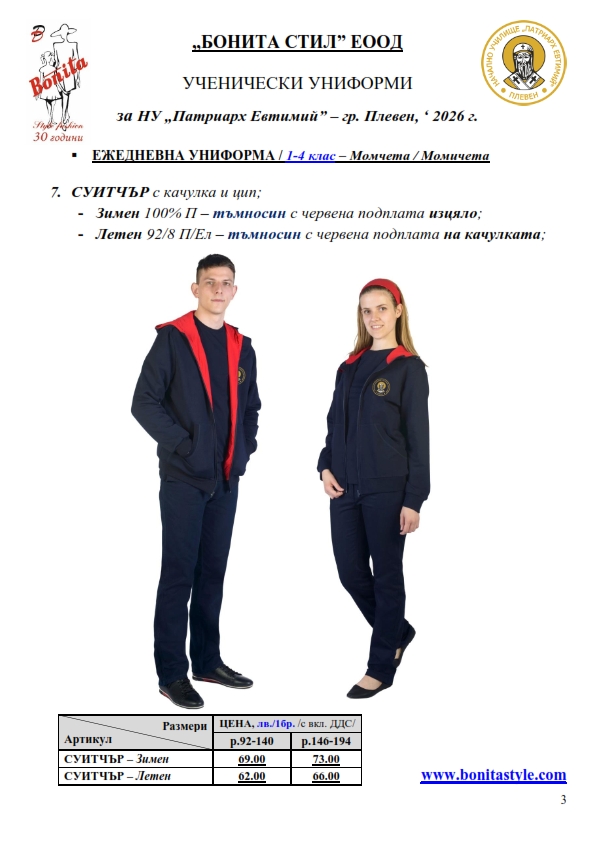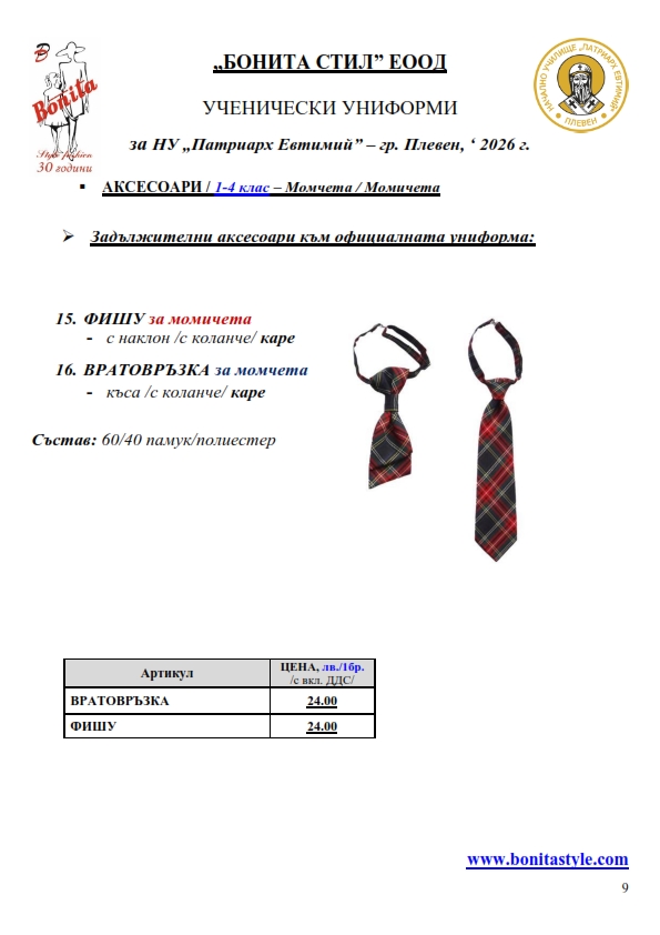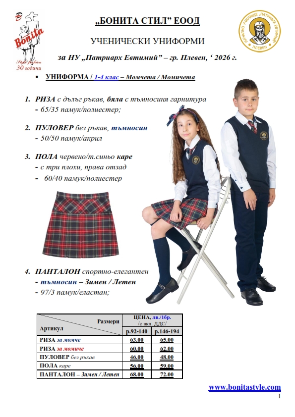 7. Гаранционни условия: “БОНИТА СТИЛ” е сертифицирана и прилага система за управление на качеството ISO 9001:2015. В съответствие с изискванията на тази система и прилаганите процедури, "БОНИТА СТИЛ" гарантира, че всички произведени от фирмата продукти отговарят на изискванията на БДС и Европейските стандарти за безопасност и качество на стоките и услугите. Всички предлагани тук артикули за ученически униформи са с гаранционен срок в рамките на шест месеца. Действието на тази гаранция се простира върху всички използвани материали при установени фабрични дефекти, както и върху качеството на изработка на артикулите, при спазени всички предписани от производителя изисквания по отношение на третиране и съхранение на облеклата. Гаранцията не отнася за механични и химични увреждания на тъканите, причинени от Клиента при употреба и третиране.