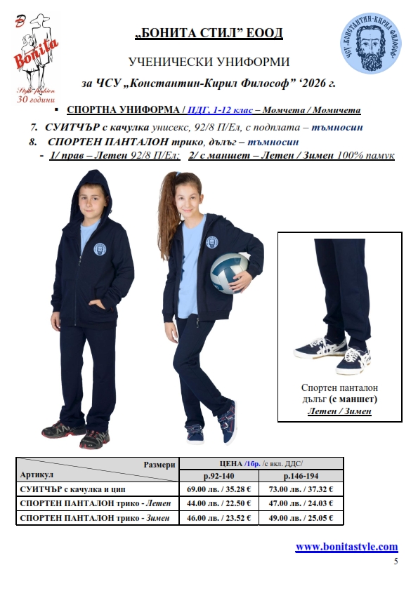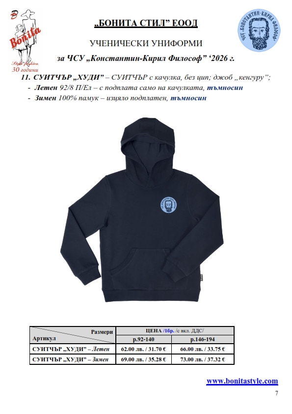 7. Гаранционни условия: “БОНИТА СТИЛ” е сертифицирана и прилага система за управление на качеството ISO 9001:2015. В съответствие с изискванията на тази система и прилаганите процедури, "БОНИТА СТИЛ" гарантира, че всички произведени от фирмата продукти отговарят на изискванията на БДС и Европейските стандарти за безопасност и качество на стоките и услугите. Всички предлагани тук артикули за ученически униформи са с гаранционен срок в рамките на шест месеца. Действието на тази гаранция се простира върху всички използвани материали при установени фабрични дефекти, както и върху качеството на изработка на артикулите, при спазени всички предписани от производителя изисквания по отношение на третиране и съхранение на облеклата. Гаранцията не отнася за механични и химични увреждания на тъканите, причинени от Клиента при употреба и третиране.