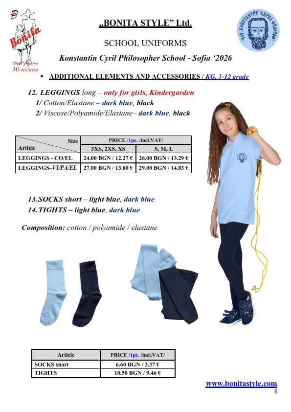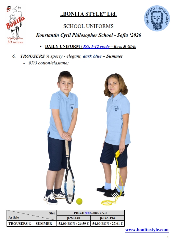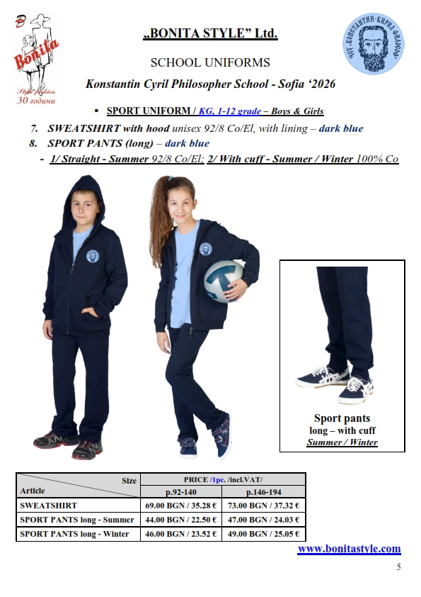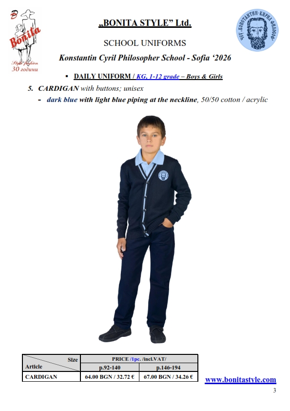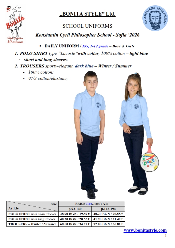 7. Гаранционни условия: “БОНИТА СТИЛ” е сертифицирана и прилага система за управление на качеството ISO 9001:2015. В съответствие с изискванията на тази система и прилаганите процедури, "БОНИТА СТИЛ" гарантира, че всички произведени от фирмата продукти отговарят на изискванията на БДС и Европейските стандарти за безопасност и качество на стоките и услугите. Всички предлагани тук артикули за ученически униформи са с гаранционен срок в рамките на шест месеца. Действието на тази гаранция се простира върху всички използвани материали при установени фабрични дефекти, както и върху качеството на изработка на артикулите, при спазени всички предписани от производителя изисквания по отношение на третиране и съхранение на облеклата. Гаранцията не отнася за механични и химични увреждания на тъканите, причинени от Клиента при употреба и третиране.