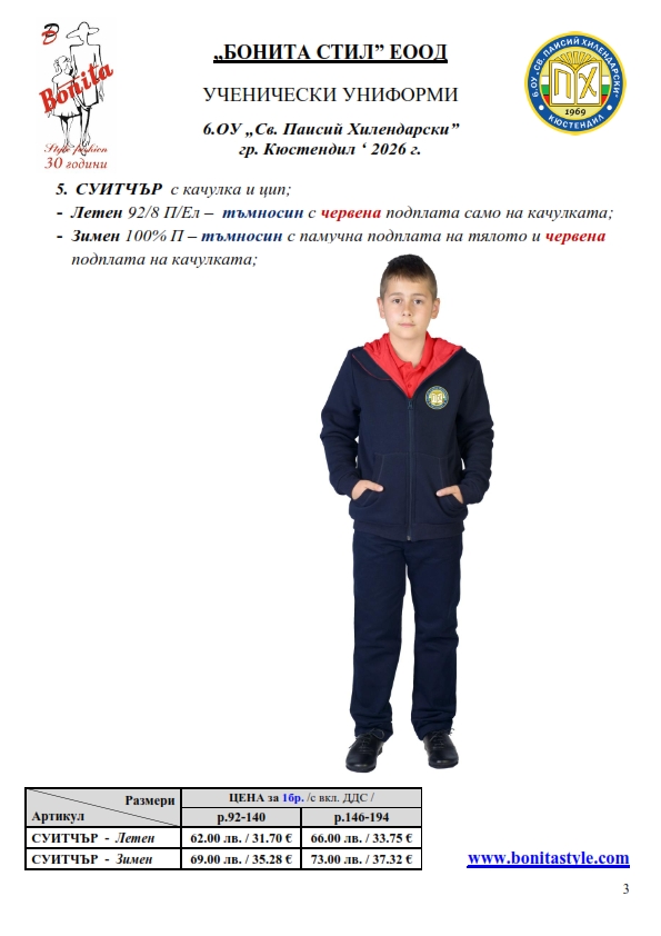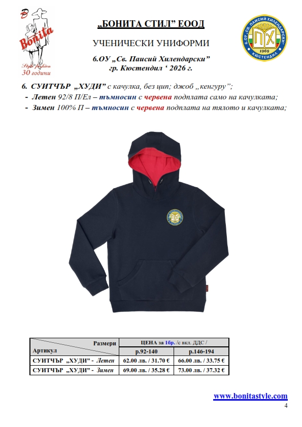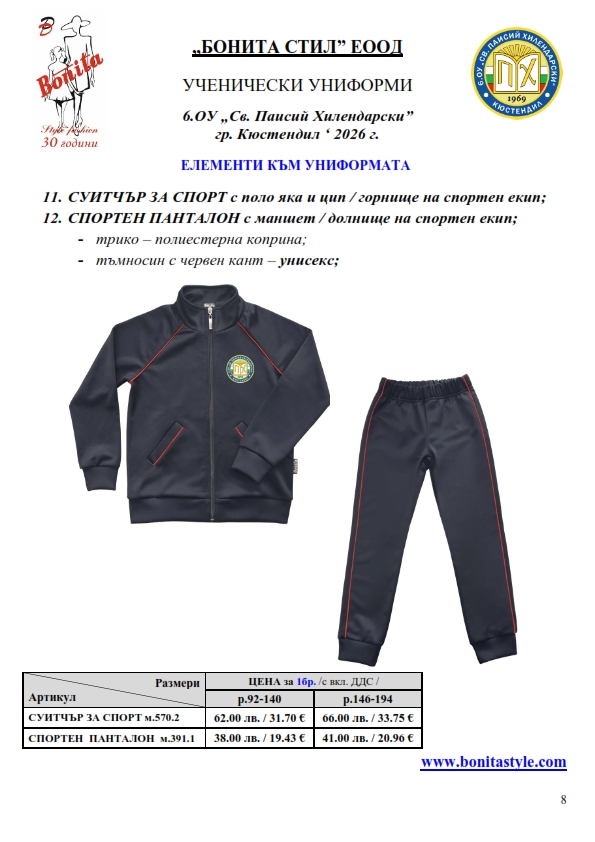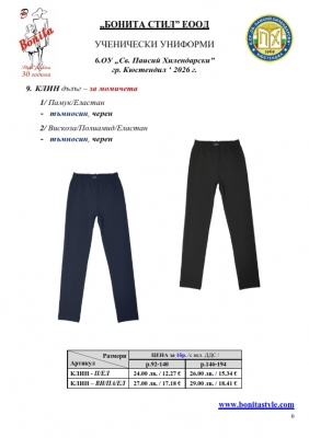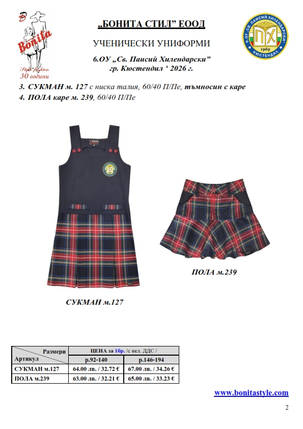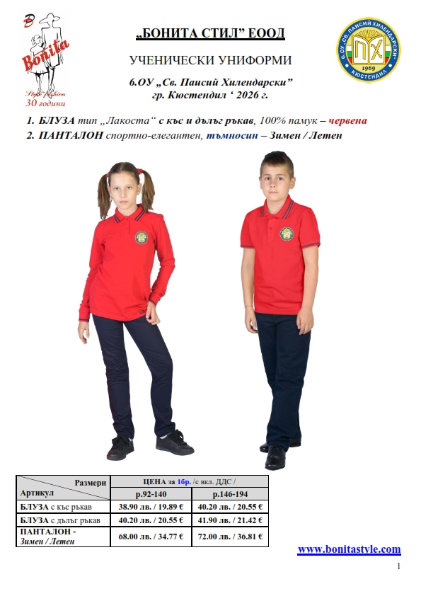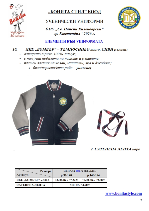 7. Гаранционни условия: “БОНИТА СТИЛ” е сертифицирана и прилага система за управление на качеството ISO 9001:2015. В съответствие с изискванията на тази система и прилаганите процедури, "БОНИТА СТИЛ" гарантира, че всички произведени от фирмата продукти отговарят на изискванията на БДС и Европейските стандарти за безопасност и качество на стоките и услугите. Всички предлагани тук артикули за ученически униформи са с гаранционен срок в рамките на шест месеца. Действието на тази гаранция се простира върху всички използвани материали при установени фабрични дефекти, както и върху качеството на изработка на артикулите, при спазени всички предписани от производителя изисквания по отношение на третиране и съхранение на облеклата. Гаранцията не отнася за механични и химични увреждания на тъканите, причинени от Клиента при употреба и третиране.