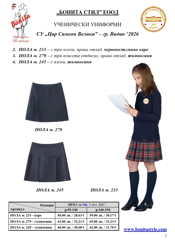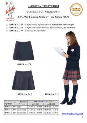 2. Единичните цени по артикули са калкулирани за договорените с училището основни материали. В случай, че Клиентът желае промяна на предвидените модели, както и на посочените в офертата материали, цените се предоговарят;
