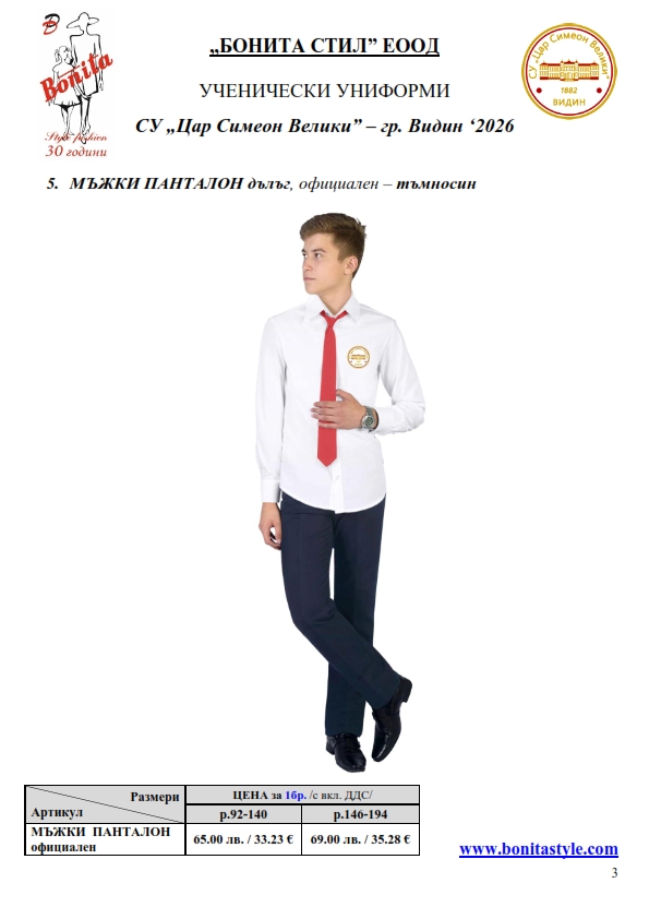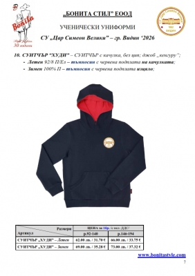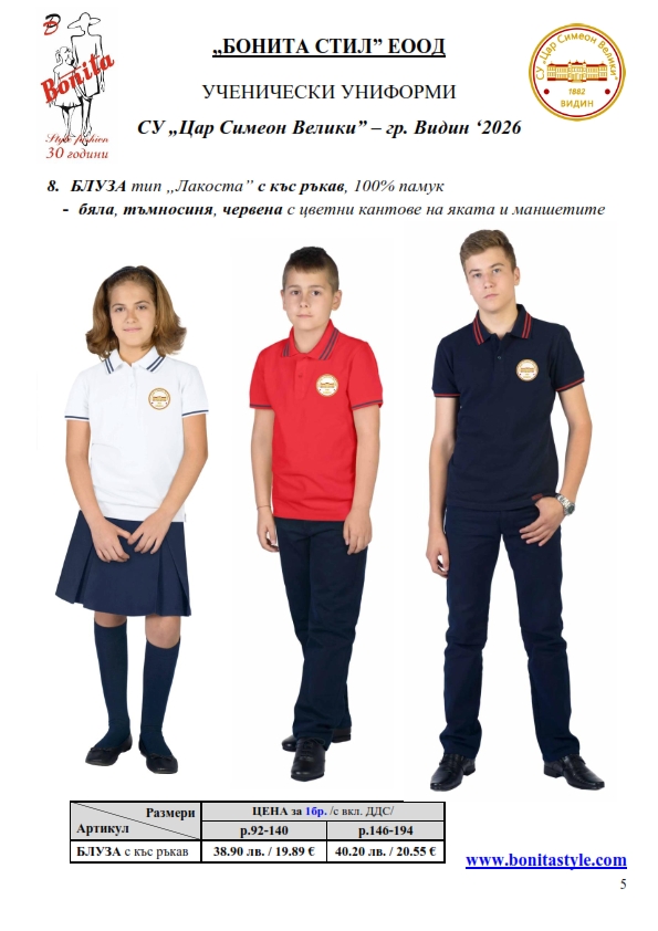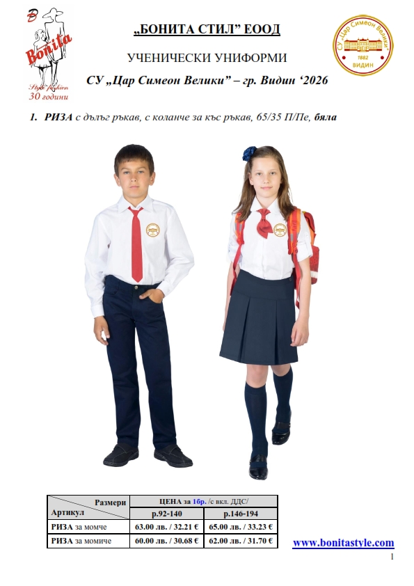 7. Гаранционни условия: “БОНИТА СТИЛ” е сертифицирана и прилага система за управление на качеството ISO 9001:2015. В съответствие с изискванията на тази система и прилаганите процедури, "БОНИТА СТИЛ" гарантира, че всички произведени от фирмата продукти отговарят на изискванията на БДС и Европейските стандарти за безопасност и качество на стоките и услугите. Всички предлагани тук артикули за ученически униформи са с гаранционен срок в рамките на шест месеца. Действието на тази гаранция се простира върху всички използвани материали при установени фабрични дефекти, както и върху качеството на изработка на артикулите, при спазени всички предписани от производителя изисквания по отношение на третиране и съхранение на облеклата. Гаранцията не отнася за механични и химични увреждания на тъканите, причинени от Клиента при употреба и третиране.
