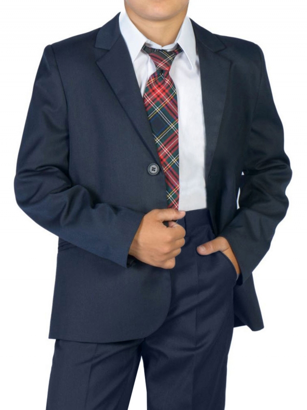 Елегантно тъмносиньо сако за момчета 1-4 клас, полувтален силует, закопчаване с две копчета, с подплата.