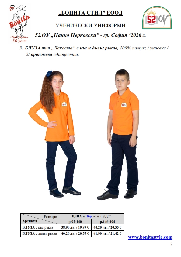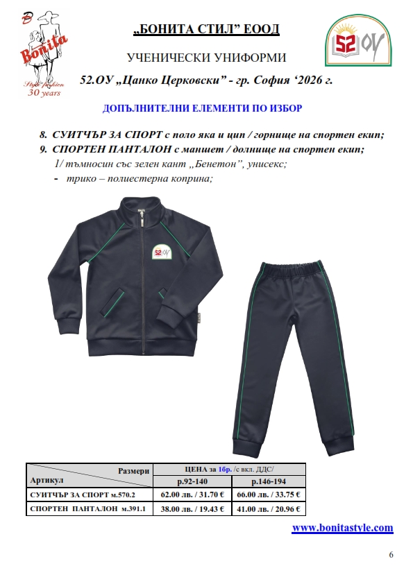 7. Гаранционни условия: “БОНИТА СТИЛ” е сертифицирана и прилага система за управление на качеството ISO 9001:2015. В съответствие с изискванията на тази система и прилаганите процедури, "БОНИТА СТИЛ" гарантира, че всички произведени от фирмата продукти отговарят на изискванията на БДС и Европейските стандарти за безопасност и качество на стоките и услугите. Всички предлагани тук артикули за ученически униформи са с гаранционен срок в рамките на шест месеца. Действието на тази гаранция се простира върху всички използвани материали при установени фабрични дефекти, както и върху качеството на изработка на артикулите, при спазени всички предписани от производителя изисквания по отношение на третиране и съхранение на облеклата. Гаранцията не отнася за механични и химични увреждания на тъканите, причинени от Клиента при употреба и третиране.