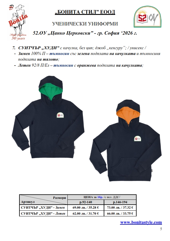 2. Единичните цени по артикули са калкулирани за договорените с училището основни материали. В случай, че Клиентът желае промяна на предвидените модели, както и на посочените в офертата материали, цените се предоговарят;