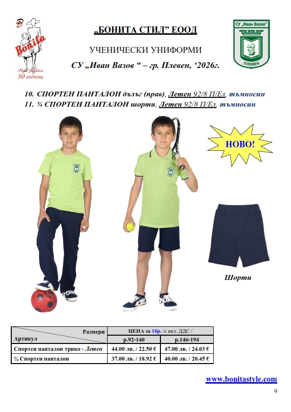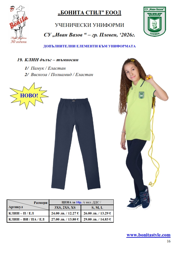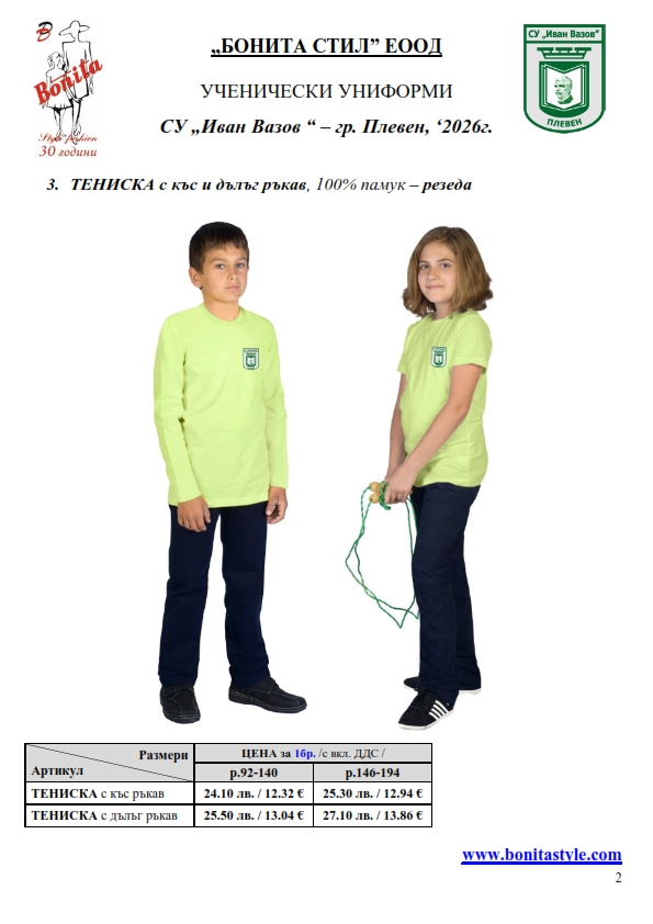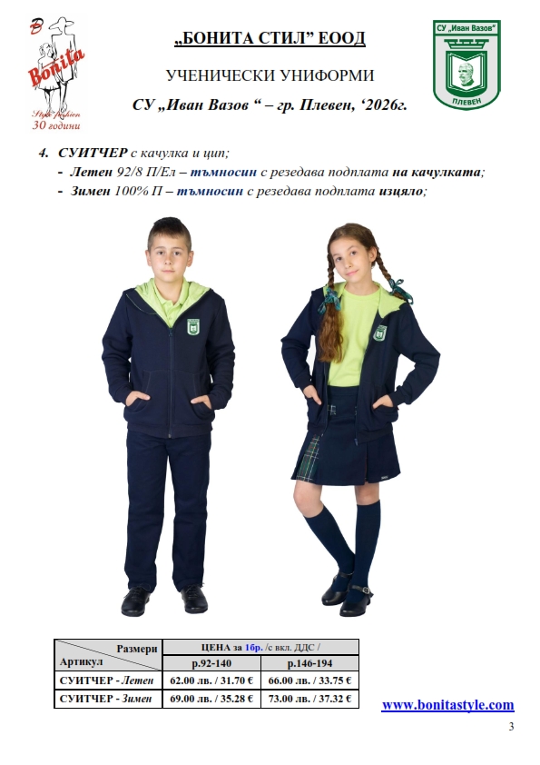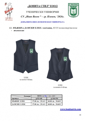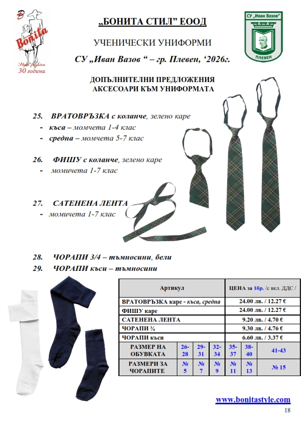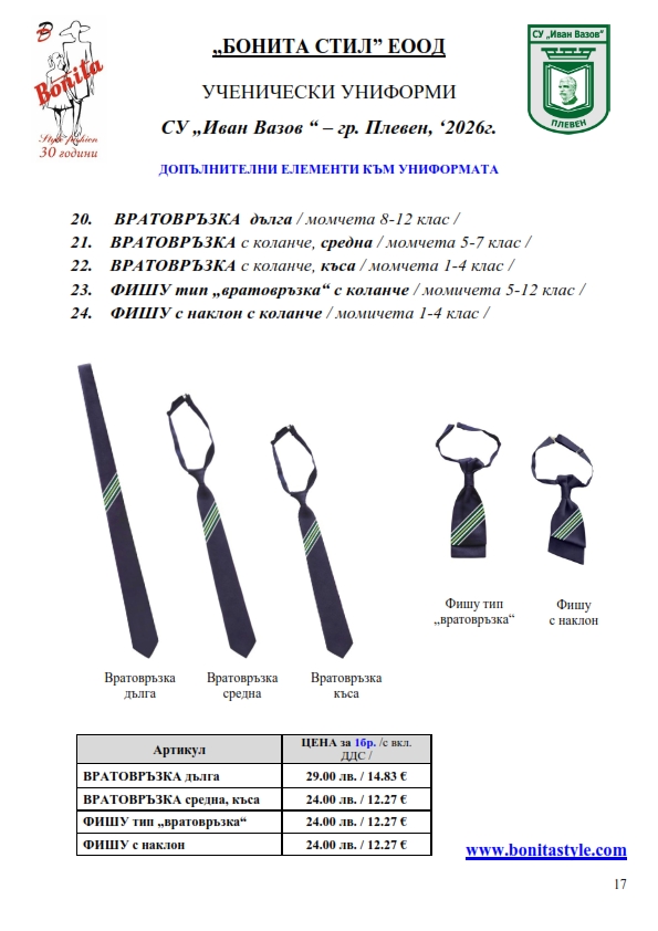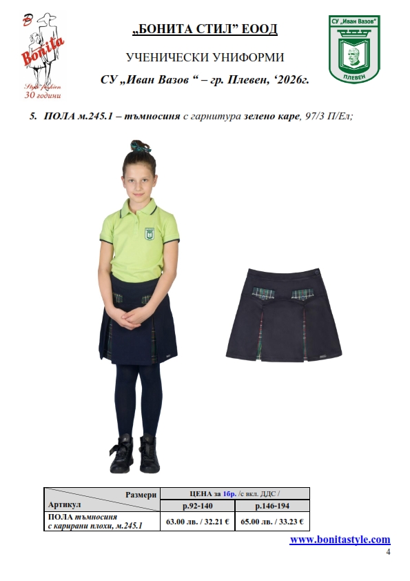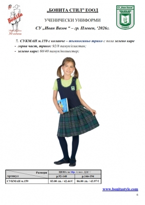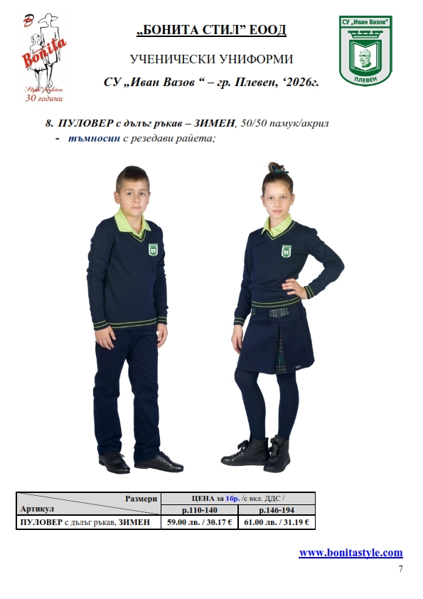 7. Гаранционни условия: “БОНИТА СТИЛ” е сертифицирана и прилага система за управление на качеството ISO 9001:2015. В съответствие с изискванията на тази система и прилаганите процедури, "БОНИТА СТИЛ" гарантира, че всички произведени от фирмата продукти отговарят на изискванията на БДС и Европейските стандарти за безопасност и качество на стоките и услугите. Всички предлагани тук артикули за ученически униформи са с гаранционен срок в рамките на шест месеца. Действието на тази гаранция се простира върху всички използвани материали при установени фабрични дефекти, както и върху качеството на изработка на артикулите, при спазени всички предписани от производителя изисквания по отношение на третиране и съхранение на облеклата. Гаранцията не отнася за механични и химични увреждания на тъканите, причинени от Клиента при употреба и третиране.
