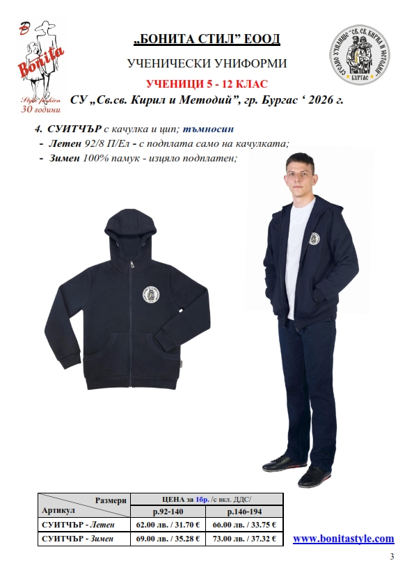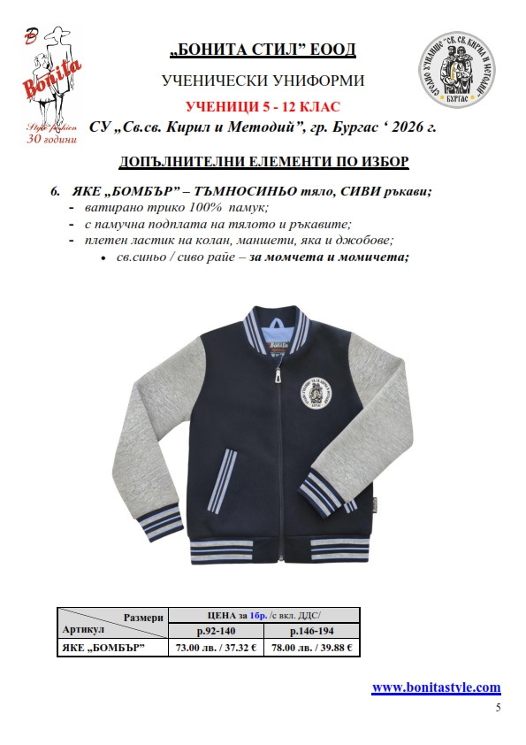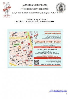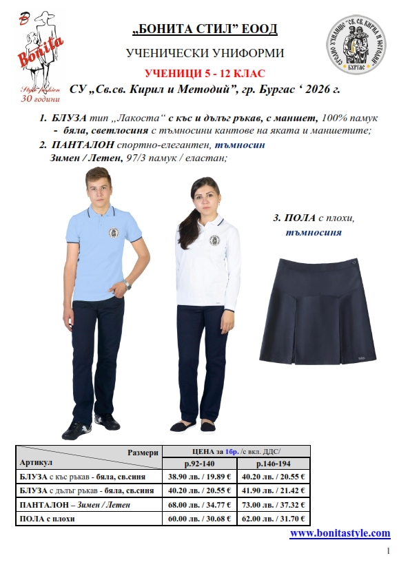 7. Гаранционни условия: “БОНИТА СТИЛ” е сертифицирана и прилага система за управление на качеството ISO 9001:2015. В съответствие с изискванията на тази система и прилаганите процедури, "БОНИТА СТИЛ" гарантира, че всички произведени от фирмата продукти отговарят на изискванията на БДС и Европейските стандарти за безопасност и качество на стоките и услугите. Всички предлагани тук артикули за ученически униформи са с гаранционен срок в рамките на шест месеца. Действието на тази гаранция се простира върху всички използвани материали при установени фабрични дефекти, както и върху качеството на изработка на артикулите, при спазени всички предписани от производителя изисквания по отношение на третиране и съхранение на облеклата. Гаранцията не отнася за механични и химични увреждания на тъканите, причинени от Клиента при употреба и третиране.