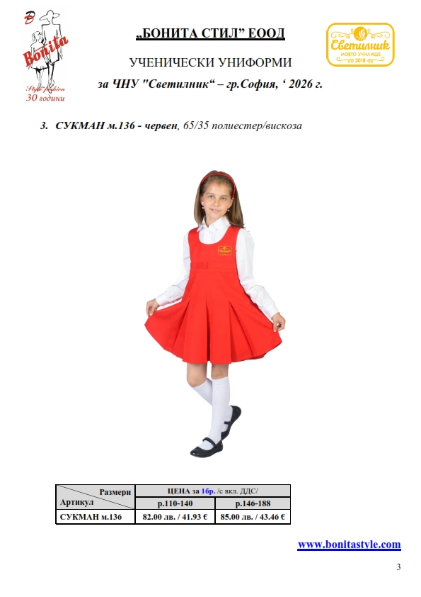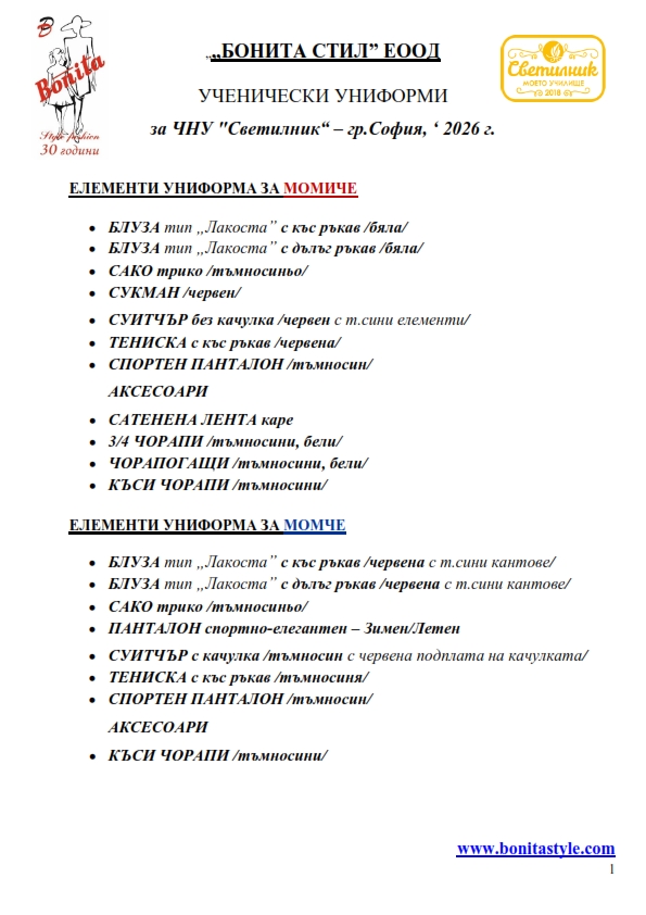 7. Гаранционни условия: “БОНИТА СТИЛ” е сертифицирана и прилага система за управление на качеството ISO 9001:2015. В съответствие с изискванията на тази система и прилаганите процедури, "БОНИТА СТИЛ" гарантира, че всички произведени от фирмата продукти отговарят на изискванията на БДС и Европейските стандарти за безопасност и качество на стоките и услугите. Всички предлагани тук артикули за ученически униформи са с гаранционен срок в рамките на шест месеца. Действието на тази гаранция се простира върху всички използвани материали при установени фабрични дефекти, както и върху качеството на изработка на артикулите, при спазени всички предписани от производителя изисквания по отношение на третиране и съхранение на облеклата. Гаранцията не отнася за механични и химични увреждания на тъканите, причинени от Клиента при употреба и третиране.