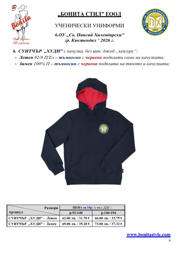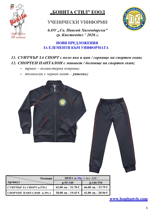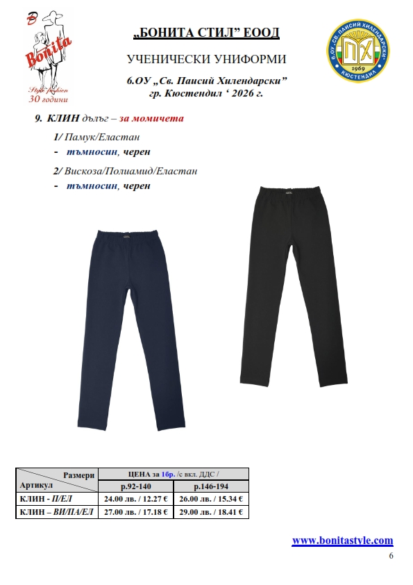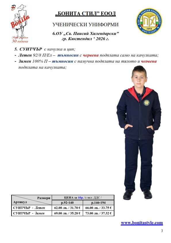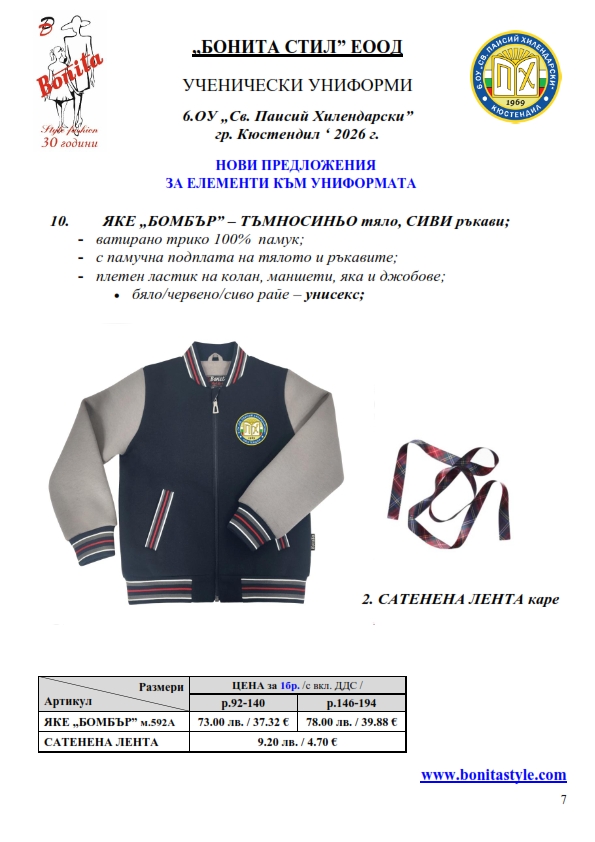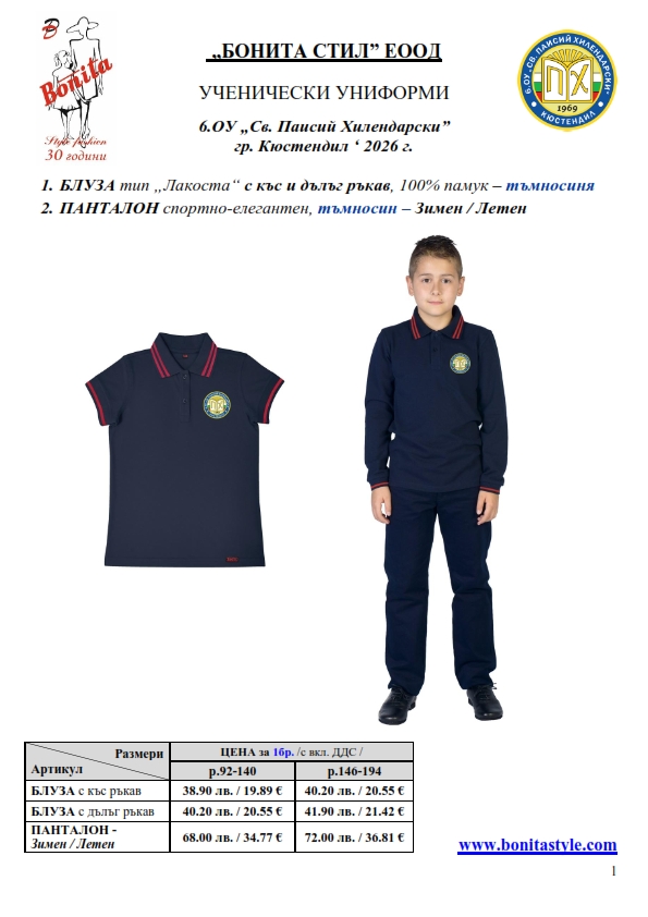 7. Гаранционни условия: “БОНИТА СТИЛ” е сертифицирана и прилага система за управление на качеството ISO 9001:2015. В съответствие с изискванията на тази система и прилаганите процедури, "БОНИТА СТИЛ" гарантира, че всички произведени от фирмата продукти отговарят на изискванията на БДС и Европейските стандарти за безопасност и качество на стоките и услугите. Всички предлагани тук артикули за ученически униформи са с гаранционен срок в рамките на шест месеца. Действието на тази гаранция се простира върху всички използвани материали при установени фабрични дефекти, както и върху качеството на изработка на артикулите, при спазени всички предписани от производителя изисквания по отношение на третиране и съхранение на облеклата. Гаранцията не отнася за механични и химични увреждания на тъканите, причинени от Клиента при употреба и третиране.