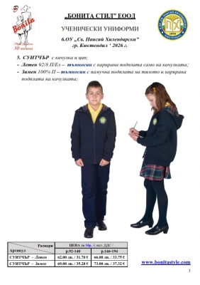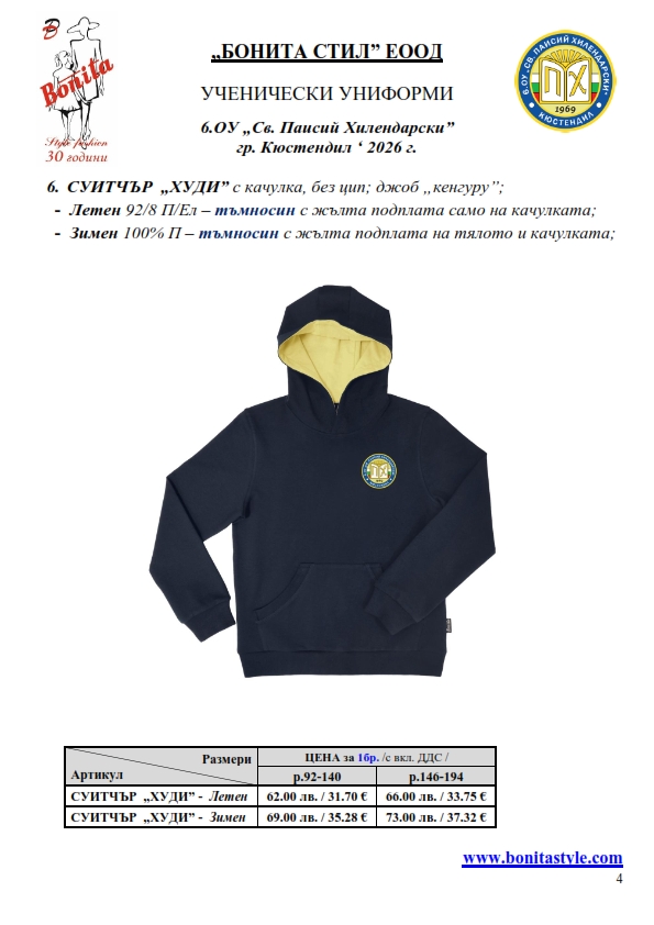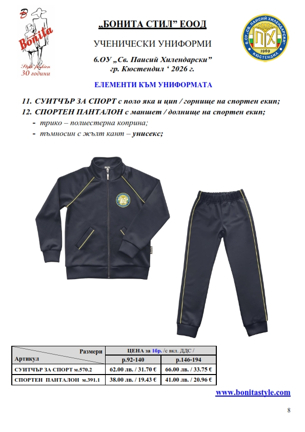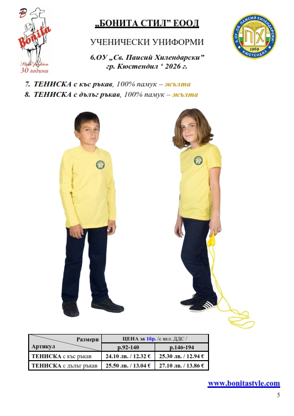 7. Гаранционни условия: “БОНИТА СТИЛ” е сертифицирана и прилага система за управление на качеството ISO 9001:2015. В съответствие с изискванията на тази система и прилаганите процедури, "БОНИТА СТИЛ" гарантира, че всички произведени от фирмата продукти отговарят на изискванията на БДС и Европейските стандарти за безопасност и качество на стоките и услугите. Всички предлагани тук артикули за ученически униформи са с гаранционен срок в рамките на шест месеца. Действието на тази гаранция се простира върху всички използвани материали при установени фабрични дефекти, както и върху качеството на изработка на артикулите, при спазени всички предписани от производителя изисквания по отношение на третиране и съхранение на облеклата. Гаранцията не отнася за механични и химични увреждания на тъканите, причинени от Клиента при употреба и третиране.