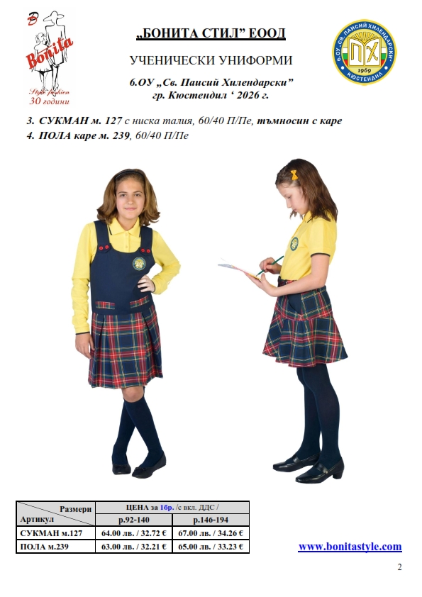 2. Единичните цени по артикули са калкулирани за договорените с училището основни материали. В случай, че Клиентът желае промяна на предвидените модели, както и на посочените в офертата материали, цените се предоговарят;