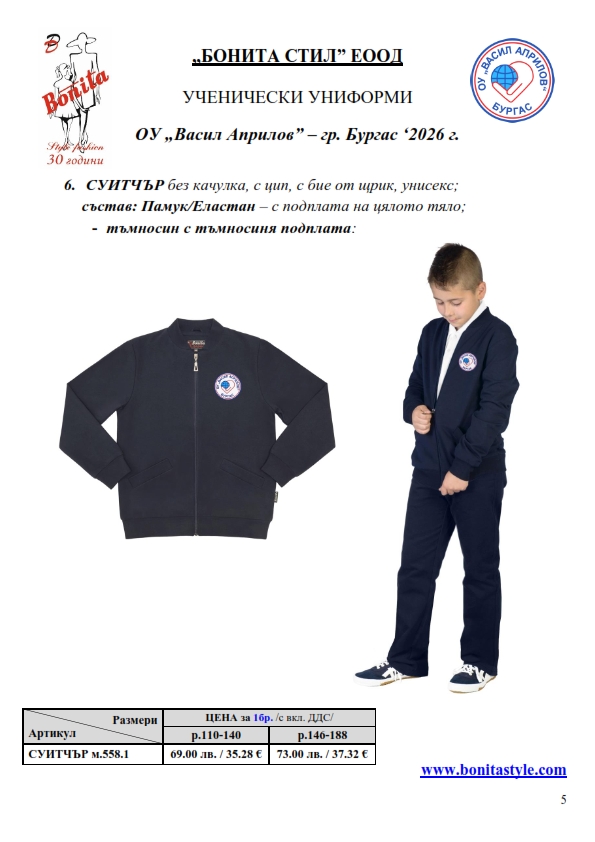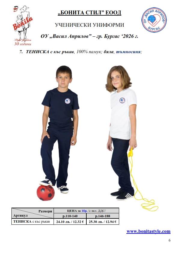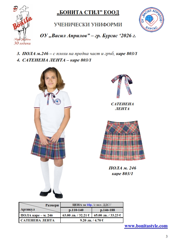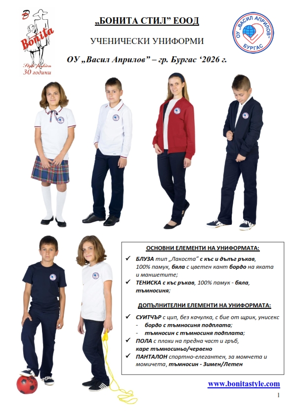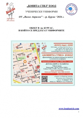 7. Гаранционни условия: “БОНИТА СТИЛ” е сертифицирана и прилага система за управление на качеството ISO 9001:2015. В съответствие с изискванията на тази система и прилаганите процедури, "БОНИТА СТИЛ" гарантира, че всички произведени от фирмата продукти отговарят на изискванията на БДС и Европейските стандарти за безопасност и качество на стоките и услугите. Всички предлагани тук артикули за ученически униформи са с гаранционен срок в рамките на шест месеца. Действието на тази гаранция се простира върху всички използвани материали при установени фабрични дефекти, както и върху качеството на изработка на артикулите, при спазени всички предписани от производителя изисквания по отношение на третиране и съхранение на облеклата. Гаранцията не отнася за механични и химични увреждания на тъканите, причинени от Клиента при употреба и третиране.