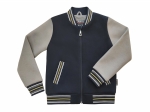 ЯКЕ с цип "БОМБЪР". Тъмносиньо тяло със сиви ръкави, подплата на тялото и ръкавите от сив сингъл, колани, маншети, яки и филетки от плетен щрик с жълто райе. УНИСЕКС