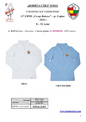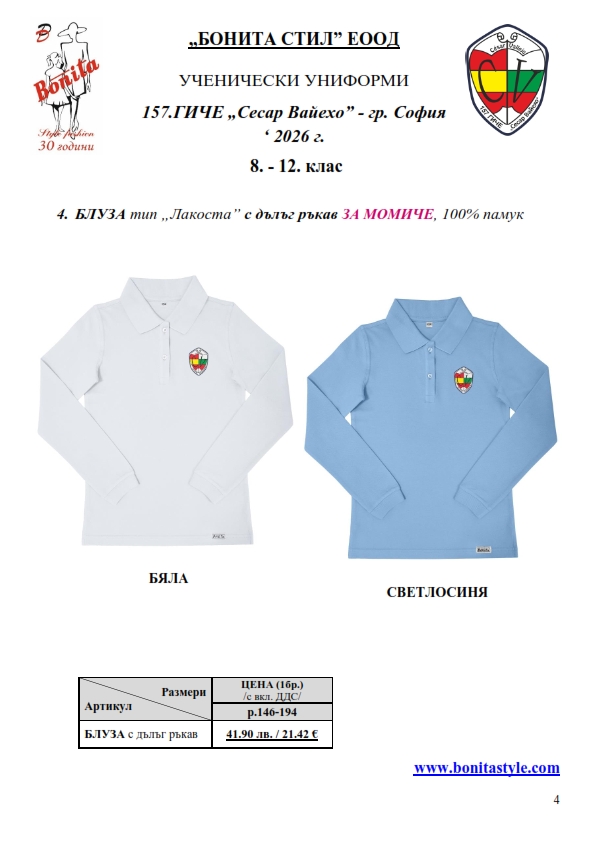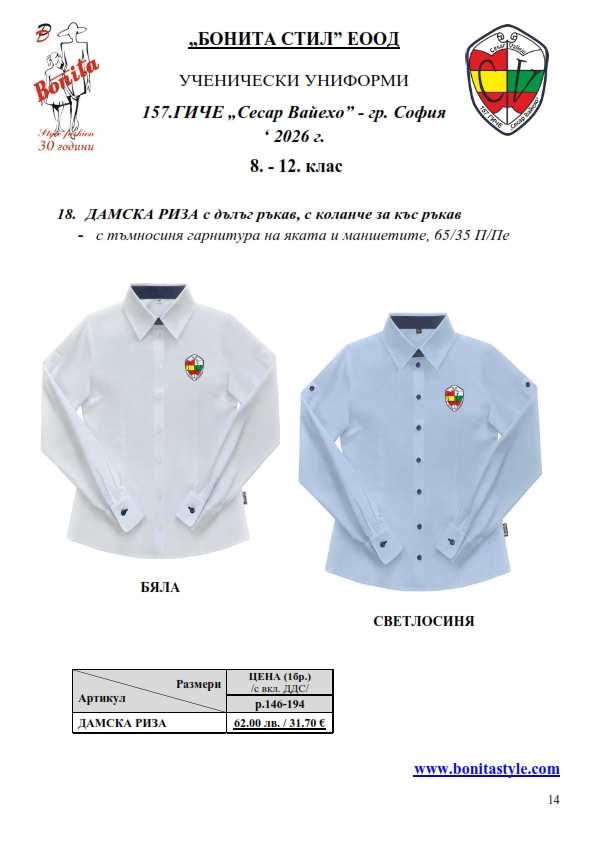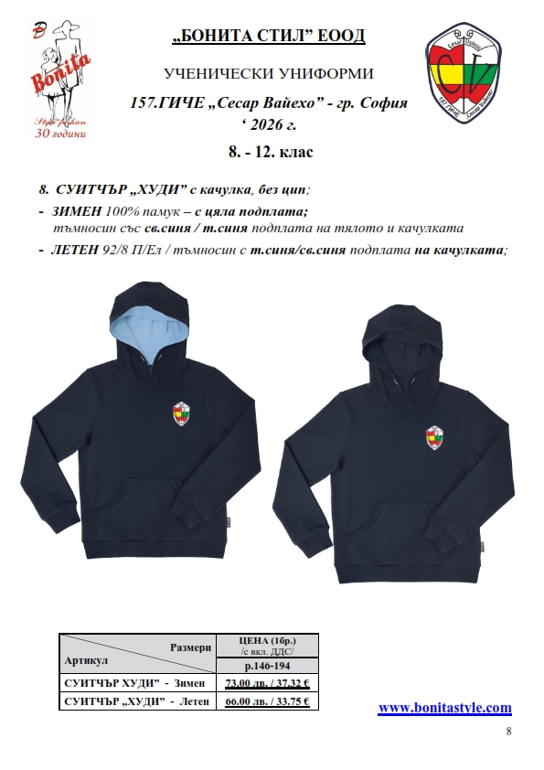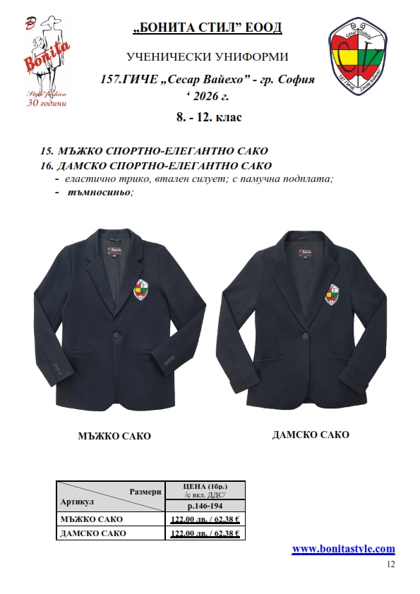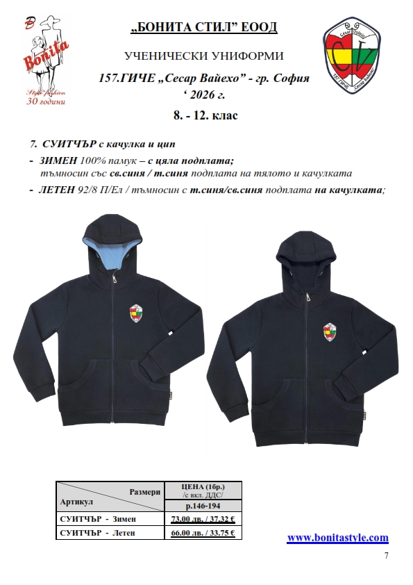 7. Гаранционни условия: “БОНИТА СТИЛ” е сертифицирана и прилага система за управление на качеството ISO 9001:2015. В съответствие с изискванията на тази система и прилаганите процедури, "БОНИТА СТИЛ" гарантира, че всички произведени от фирмата продукти отговарят на изискванията на БДС и Европейските стандарти за безопасност и качество на стоките и услугите. Всички предлагани тук артикули за ученически униформи са с гаранционен срок в рамките на шест месеца. Действието на тази гаранция се простира върху всички използвани материали при установени фабрични дефекти, както и върху качеството на изработка на артикулите, при спазени всички предписани от производителя изисквания по отношение на третиране и съхранение на облеклата. Гаранцията не отнася за механични и химични увреждания на тъканите, причинени от Клиента при употреба и третиране.