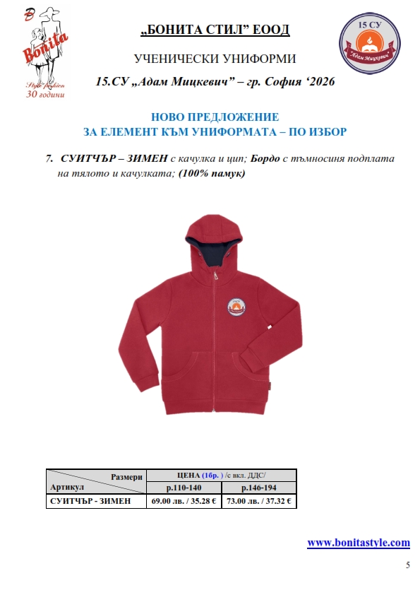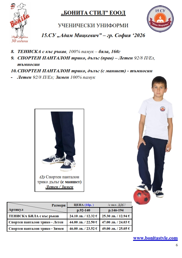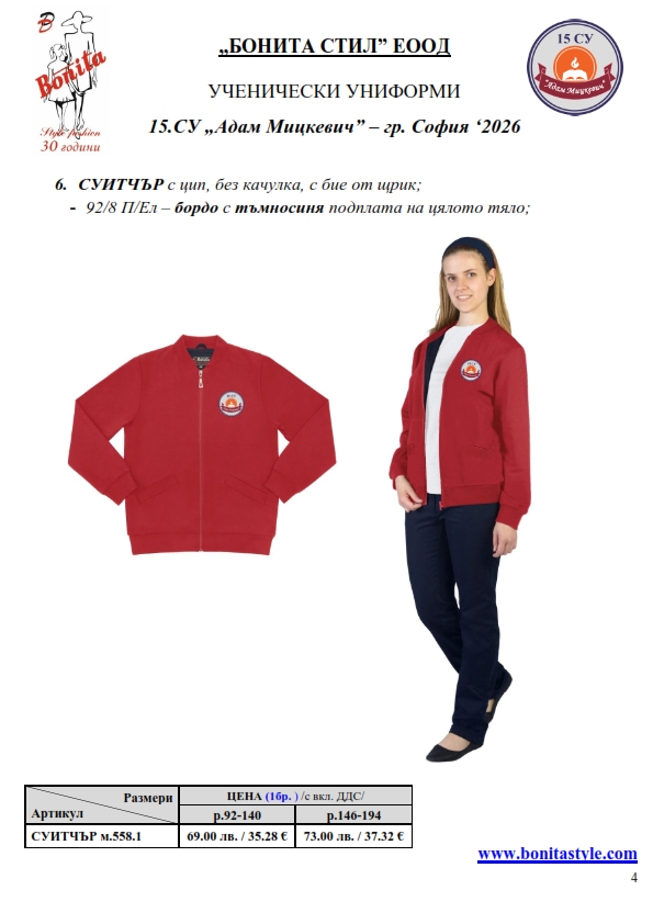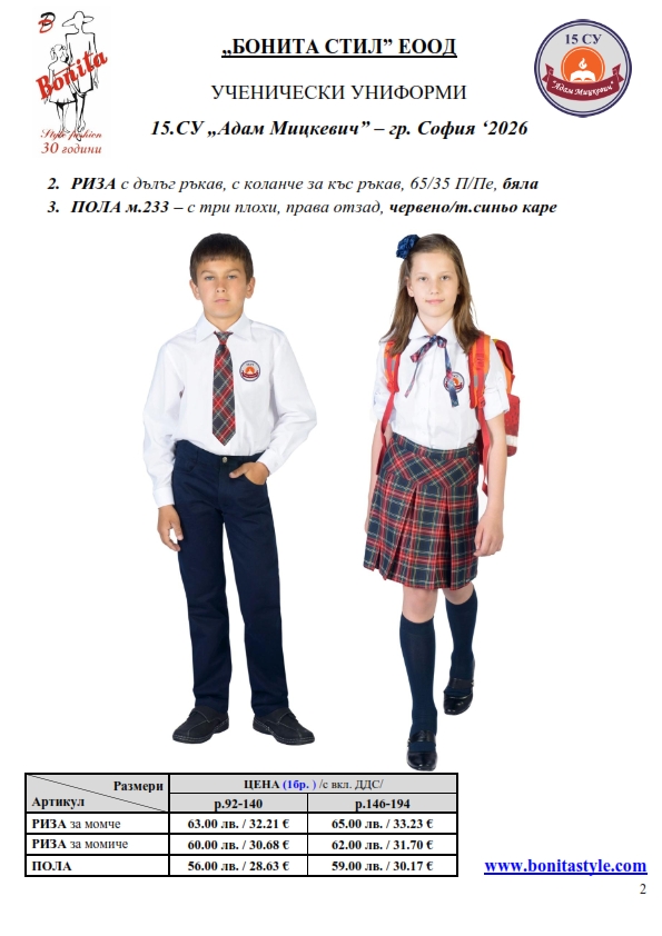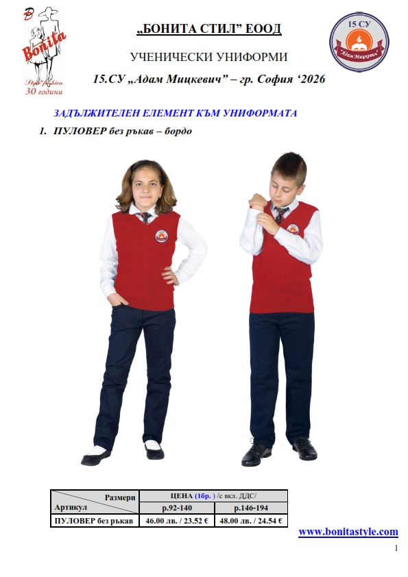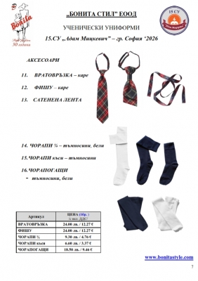 7. Гаранционни условия: “БОНИТА СТИЛ” е сертифицирана и прилага система за управление на качеството ISO 9001:2015. В съответствие с изискванията на тази система и прилаганите процедури, "БОНИТА СТИЛ" гарантира, че всички произведени от фирмата продукти отговарят на изискванията на БДС и Европейските стандарти за безопасност и качество на стоките и услугите. Всички предлагани тук артикули за ученически униформи са с гаранционен срок в рамките на шест месеца. Действието на тази гаранция се простира върху всички използвани материали при установени фабрични дефекти, както и върху качеството на изработка на артикулите, при спазени всички предписани от производителя изисквания по отношение на третиране и съхранение на облеклата. Гаранцията не отнася за механични и химични увреждания на тъканите, причинени от Клиента при употреба и третиране.