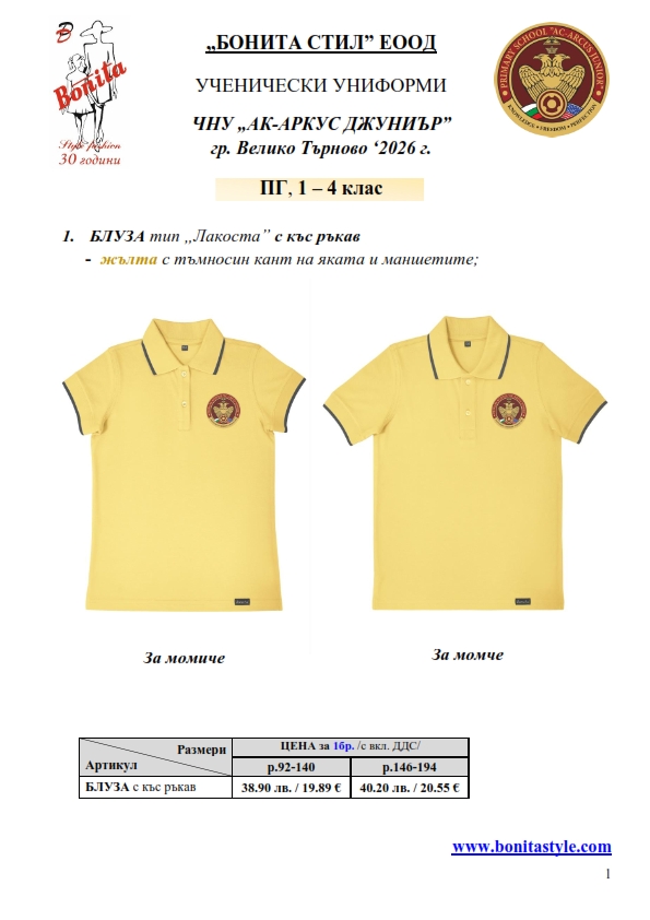 7. Гаранционни условия: “БОНИТА СТИЛ” е сертифицирана и прилага система за управление на качеството ISO 9001:2015. В съответствие с изискванията на тази система и прилаганите процедури, "БОНИТА СТИЛ" гарантира, че всички произведени от фирмата продукти отговарят на изискванията на БДС и Европейските стандарти за безопасност и качество на стоките и услугите. Всички предлагани тук артикули за ученически униформи са с гаранционен срок в рамките на шест месеца. Действието на тази гаранция се простира върху всички използвани материали при установени фабрични дефекти, както и върху качеството на изработка на артикулите, при спазени всички предписани от производителя изисквания по отношение на третиране и съхранение на облеклата. Гаранцията не отнася за механични и химични увреждания на тъканите, причинени от Клиента при употреба и третиране.