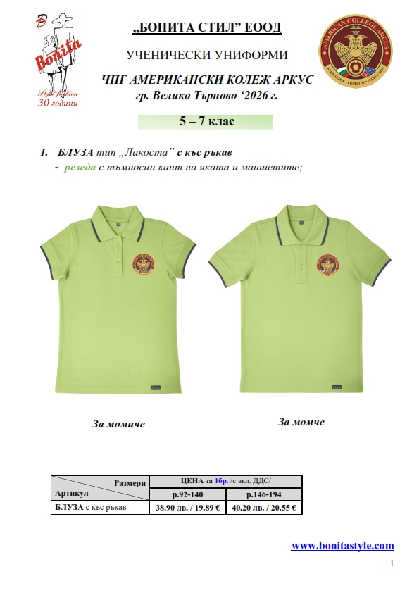7. Гаранционни условия: “БОНИТА СТИЛ” е сертифицирана и прилага система за управление на качеството ISO 9001:2015. В съответствие с изискванията на тази система и прилаганите процедури, "БОНИТА СТИЛ" гарантира, че всички произведени от фирмата продукти отговарят на изискванията на БДС и Европейските стандарти за безопасност и качество на стоките и услугите. Всички предлагани тук артикули за ученически униформи са с гаранционен срок в рамките на шест месеца. Действието на тази гаранция се простира върху всички използвани материали при установени фабрични дефекти, както и върху качеството на изработка на артикулите, при спазени всички предписани от производителя изисквания по отношение на третиране и съхранение на облеклата. Гаранцията не отнася за механични и химични увреждания на тъканите, причинени от Клиента при употреба и третиране.