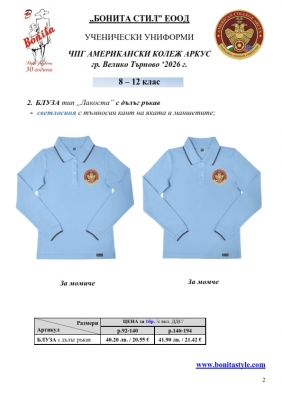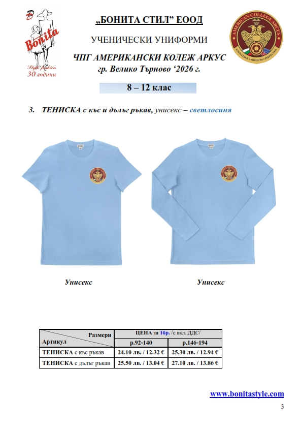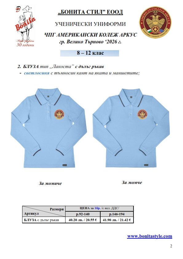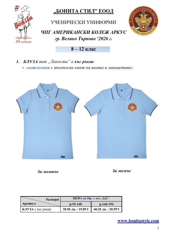 7. Гаранционни условия: “БОНИТА СТИЛ” е сертифицирана и прилага система за управление на качеството ISO 9001:2015. В съответствие с изискванията на тази система и прилаганите процедури, "БОНИТА СТИЛ" гарантира, че всички произведени от фирмата продукти отговарят на изискванията на БДС и Европейските стандарти за безопасност и качество на стоките и услугите. Всички предлагани тук артикули за ученически униформи са с гаранционен срок в рамките на шест месеца. Действието на тази гаранция се простира върху всички използвани материали при установени фабрични дефекти, както и върху качеството на изработка на артикулите, при спазени всички предписани от производителя изисквания по отношение на третиране и съхранение на облеклата. Гаранцията не отнася за механични и химични увреждания на тъканите, причинени от Клиента при употреба и третиране.