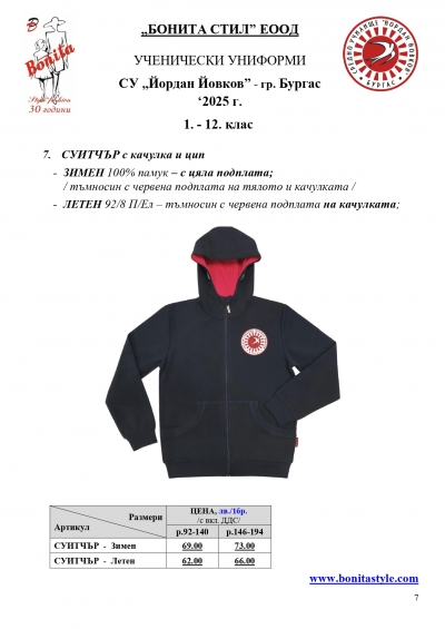 - Гаранционни условия: “БОНИТА СТИЛ” е сертифицирана и прилага система за управление на качеството ISO 9001:2015. В съответствие с изискванията на тази система и прилаганите процедури, "БОНИТА СТИЛ" гарантира, че всички произведени от фирмата продукти отговарят на изискванията на БДС и Европейските стандарти за безопасност и качество на стоките и услугите. Всички предлагани тук артикули за ученически униформи са с гаранционен срок в рамките на шест месеца. Действието на тази гаранция се простира върху всички използвани материали при установени фабрични дефекти, както и върху качеството на изработка на артикулите, при спазени всички предписани от производителя изисквания по отношение на третиране и съхранение на облеклата. Гаранцията не отнася за механични и химични увреждания на тъканите, причинени от Клиента при употреба и третиране.