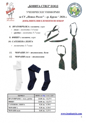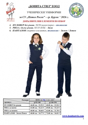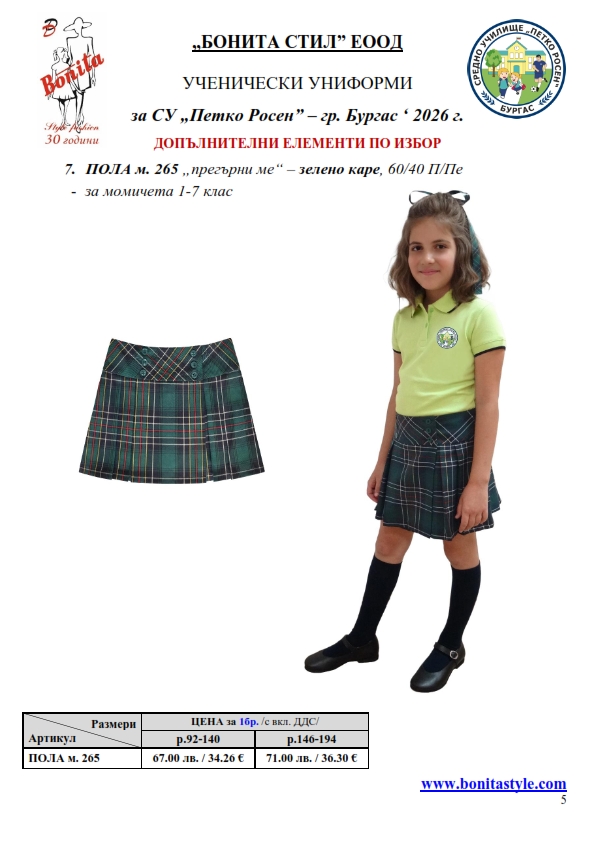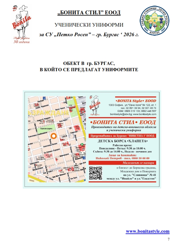 7. Гаранционни условия: “БОНИТА СТИЛ” е сертифицирана и прилага система за управление на качеството ISO 9001:2015. В съответствие с изискванията на тази система и прилаганите процедури, "БОНИТА СТИЛ" гарантира, че всички произведени от фирмата продукти отговарят на изискванията на БДС и Европейските стандарти за безопасност и качество на стоките и услугите. Всички предлагани тук артикули за ученически униформи са с гаранционен срок в рамките на шест месеца. Действието на тази гаранция се простира върху всички използвани материали при установени фабрични дефекти, както и върху качеството на изработка на артикулите, при спазени всички предписани от производителя изисквания по отношение на третиране и съхранение на облеклата. Гаранцията не отнася за механични и химични увреждания на тъканите, причинени от Клиента при употреба и третиране.