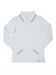 Бяла блуза тип "Лакоста" за момиче с дълъг ръкав с маншет със зелени и червени кантове на яката и маншетите.
