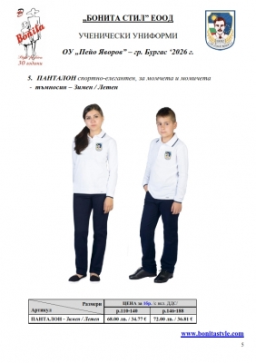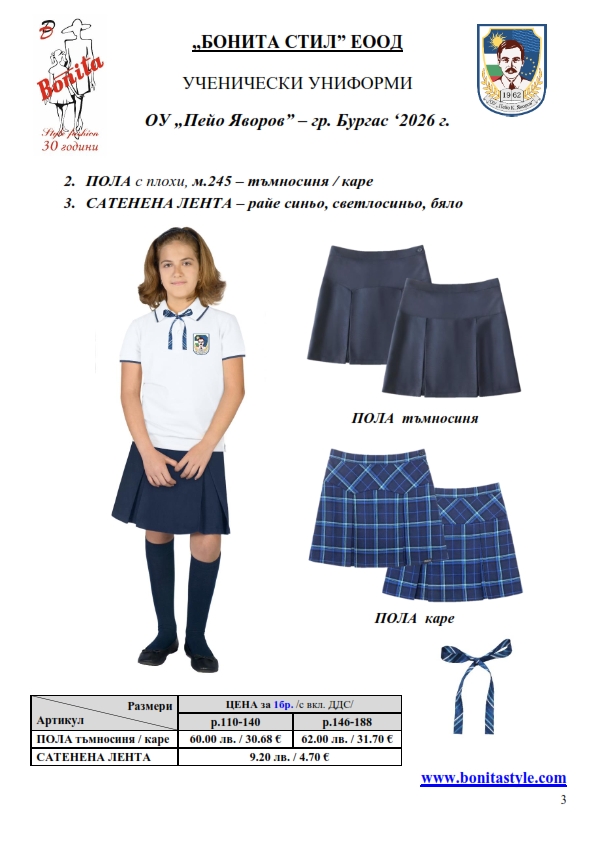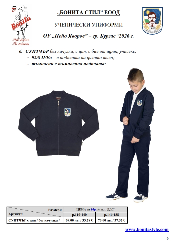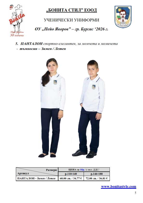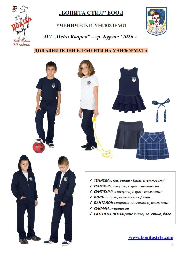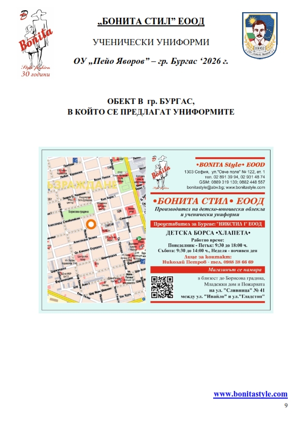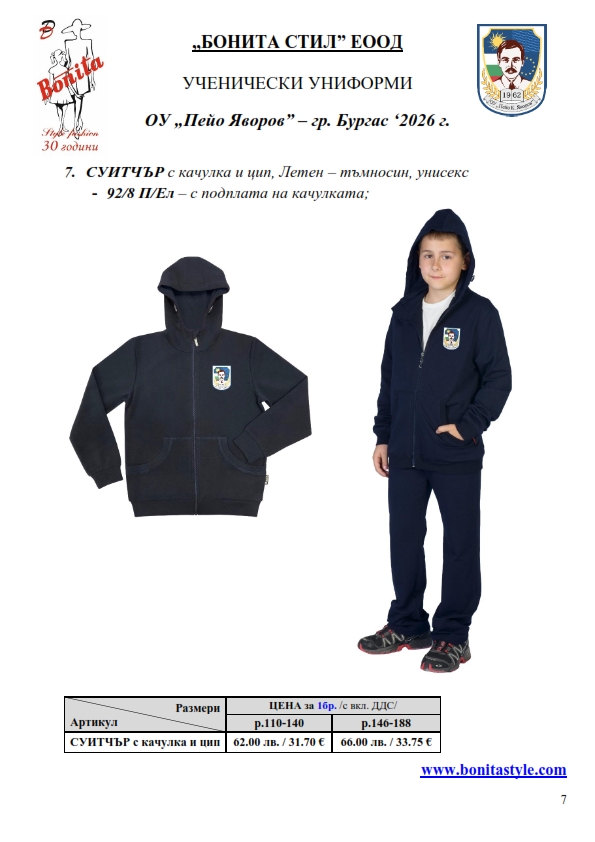 7. Гаранционни условия: “БОНИТА СТИЛ” е сертифицирана и прилага система за управление на качеството ISO 9001:2015. В съответствие с изискванията на тази система и прилаганите процедури, "БОНИТА СТИЛ" гарантира, че всички произведени от фирмата продукти отговарят на изискванията на БДС и Европейските стандарти за безопасност и качество на стоките и услугите. Всички предлагани тук артикули за ученически униформи са с гаранционен срок в рамките на шест месеца. Действието на тази гаранция се простира върху всички използвани материали при установени фабрични дефекти, както и върху качеството на изработка на артикулите, при спазени всички предписани от производителя изисквания по отношение на третиране и съхранение на облеклата. Гаранцията не отнася за механични и химични увреждания на тъканите, причинени от Клиента при употреба и третиране.