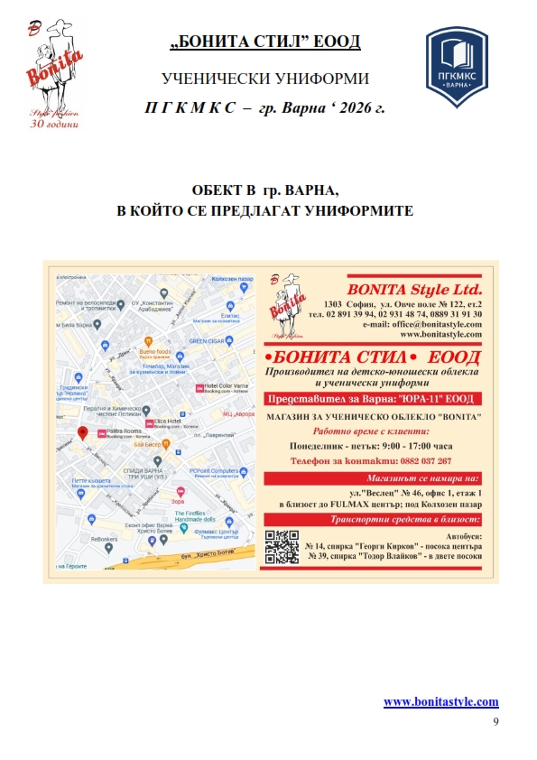 7. Гаранционни условия: “БОНИТА СТИЛ” е сертифицирана и прилага система за управление на качеството ISO 9001:2015. В съответствие с изискванията на тази система и прилаганите процедури, "БОНИТА СТИЛ" гарантира, че всички произведени от фирмата продукти отговарят на изискванията на БДС и Европейските стандарти за безопасност и качество на стоките и услугите. Всички предлагани тук артикули за ученически униформи са с гаранционен срок в рамките на шест месеца. Действието на тази гаранция се простира върху всички използвани материали при установени фабрични дефекти, както и върху качеството на изработка на артикулите, при спазени всички предписани от производителя изисквания по отношение на третиране и съхранение на облеклата. Гаранцията не отнася за механични и химични увреждания на тъканите, причинени от Клиента при употреба и третиране.