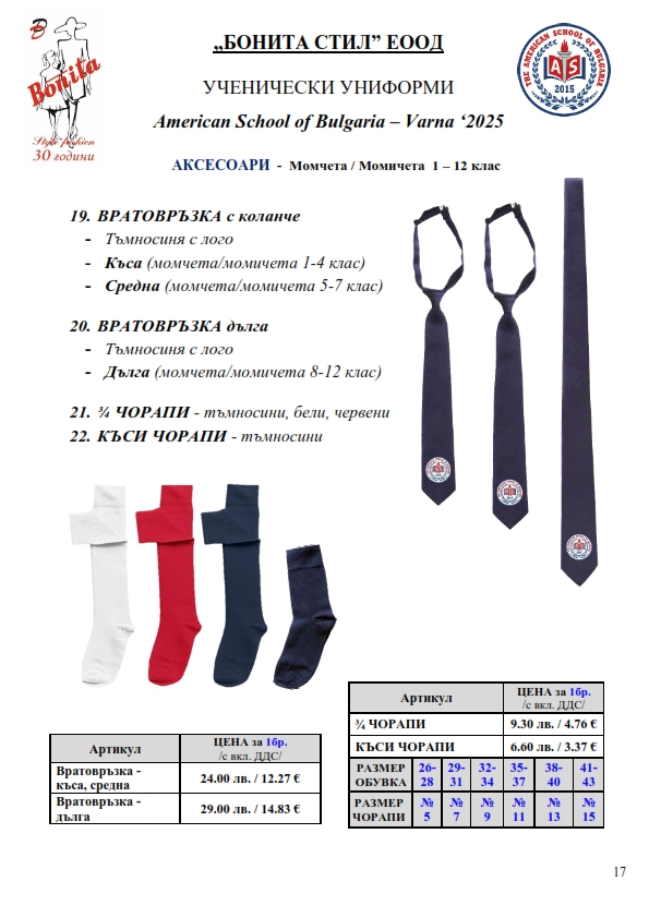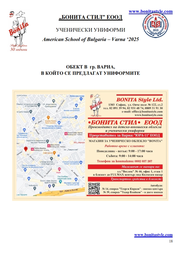 7. Гаранционни условия: “БОНИТА СТИЛ” е сертифицирана и прилага система за управление на качеството ISO 9001:2015. В съответствие с изискванията на тази система и прилаганите процедури, "БОНИТА СТИЛ" гарантира, че всички произведени от фирмата продукти отговарят на изискванията на БДС и Европейските стандарти за безопасност и качество на стоките и услугите. Всички предлагани тук артикули за ученически униформи са с гаранционен срок в рамките на шест месеца. Действието на тази гаранция се простира върху всички използвани материали при установени фабрични дефекти, както и върху качеството на изработка на артикулите, при спазени всички предписани от производителя изисквания по отношение на третиране и съхранение на облеклата. Гаранцията не отнася за механични и химични увреждания на тъканите, причинени от Клиента при употреба и третиране.