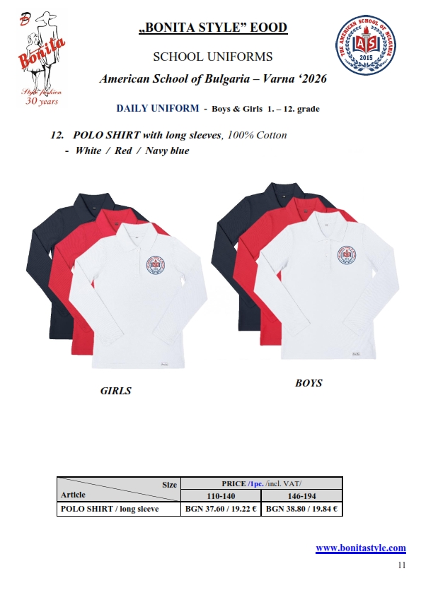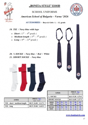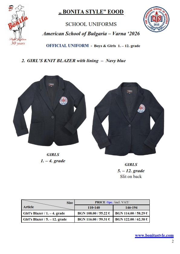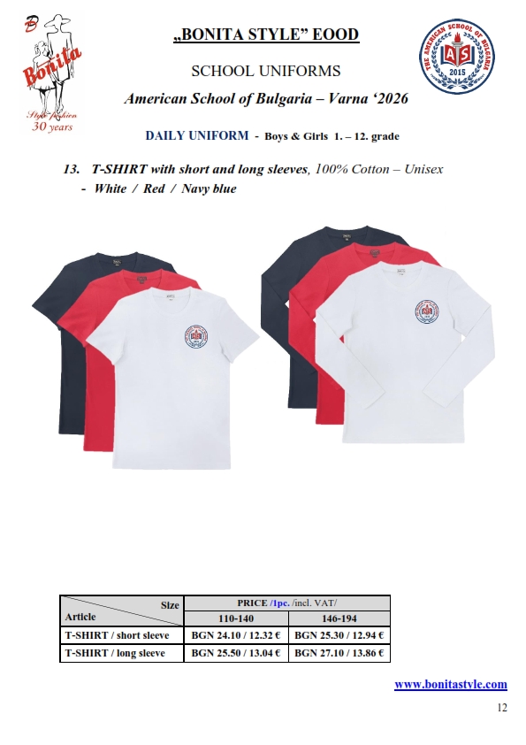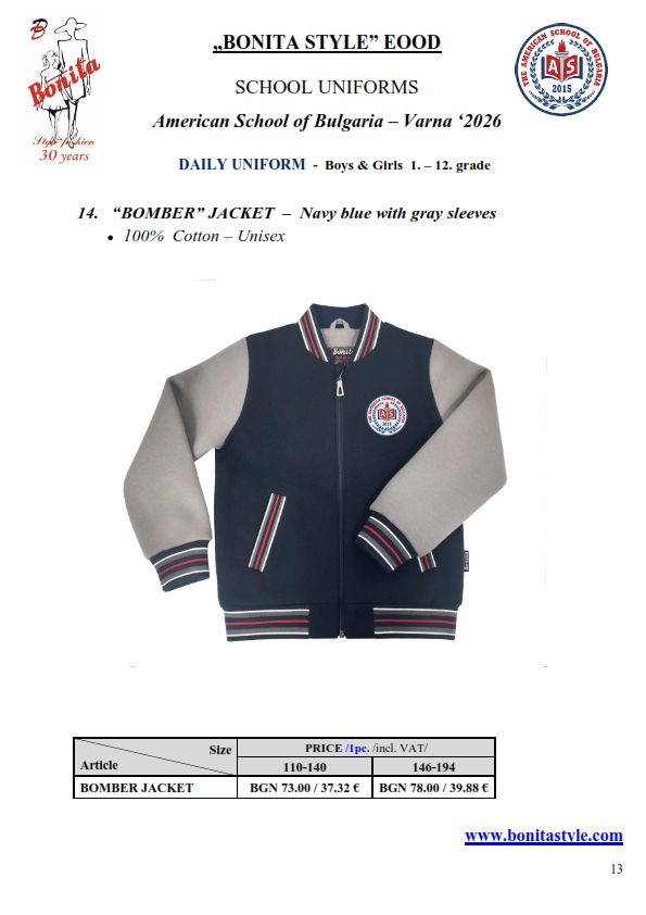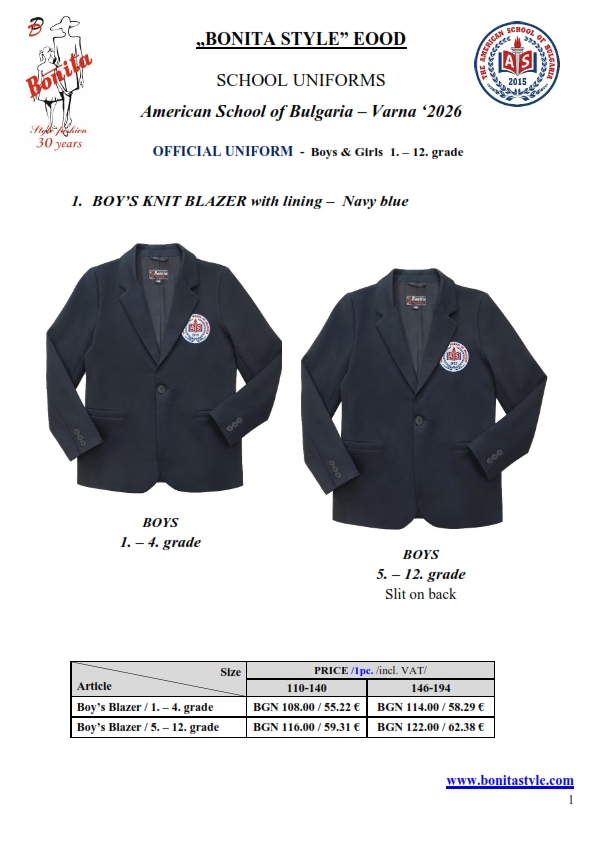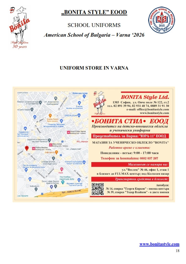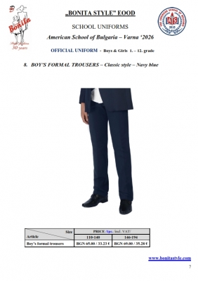 7. Гаранционни условия: “БОНИТА СТИЛ” е сертифицирана и прилага система за управление на качеството ISO 9001:2015. В съответствие с изискванията на тази система и прилаганите процедури, "БОНИТА СТИЛ" гарантира, че всички произведени от фирмата продукти отговарят на изискванията на БДС и Европейските стандарти за безопасност и качество на стоките и услугите. Всички предлагани тук артикули за ученически униформи са с гаранционен срок в рамките на шест месеца. Действието на тази гаранция се простира върху всички използвани материали при установени фабрични дефекти, както и върху качеството на изработка на артикулите, при спазени всички предписани от производителя изисквания по отношение на третиране и съхранение на облеклата. Гаранцията не отнася за механични и химични увреждания на тъканите, причинени от Клиента при употреба и третиране.
