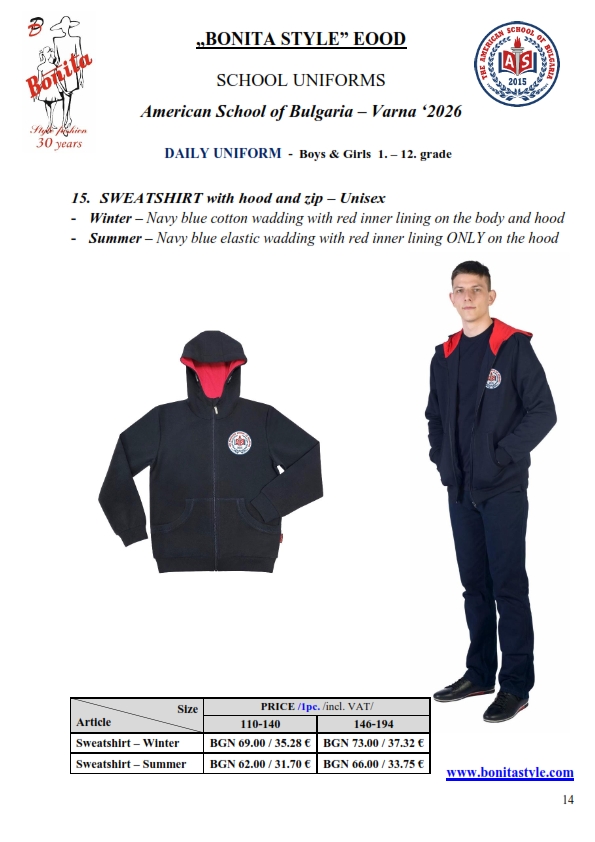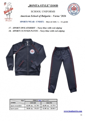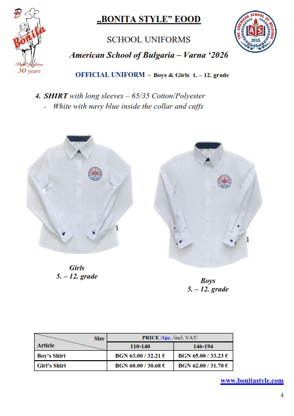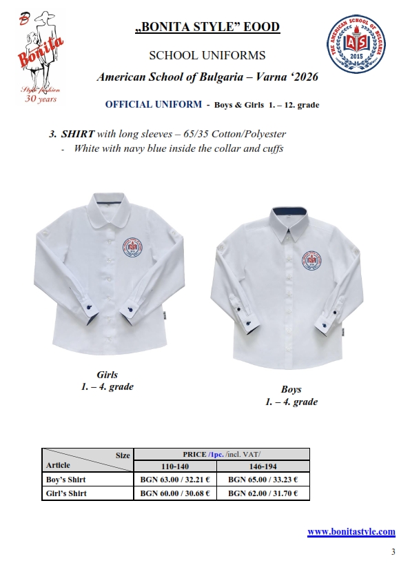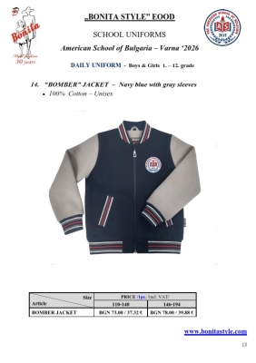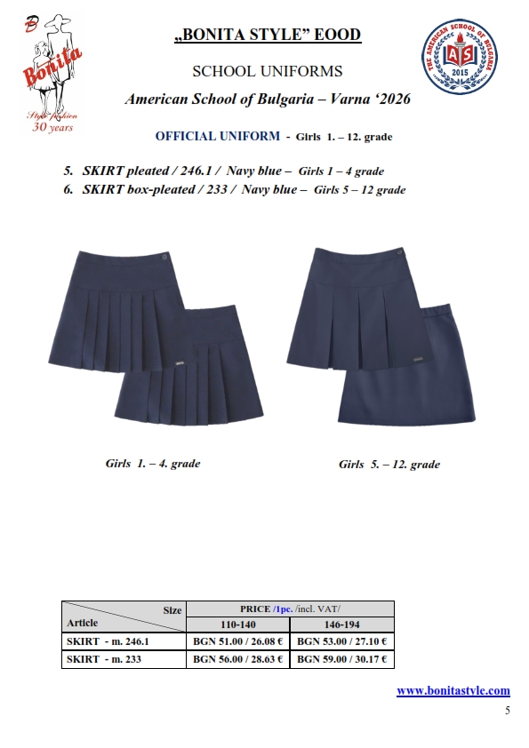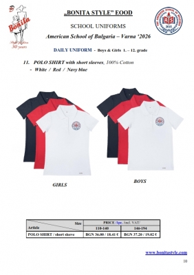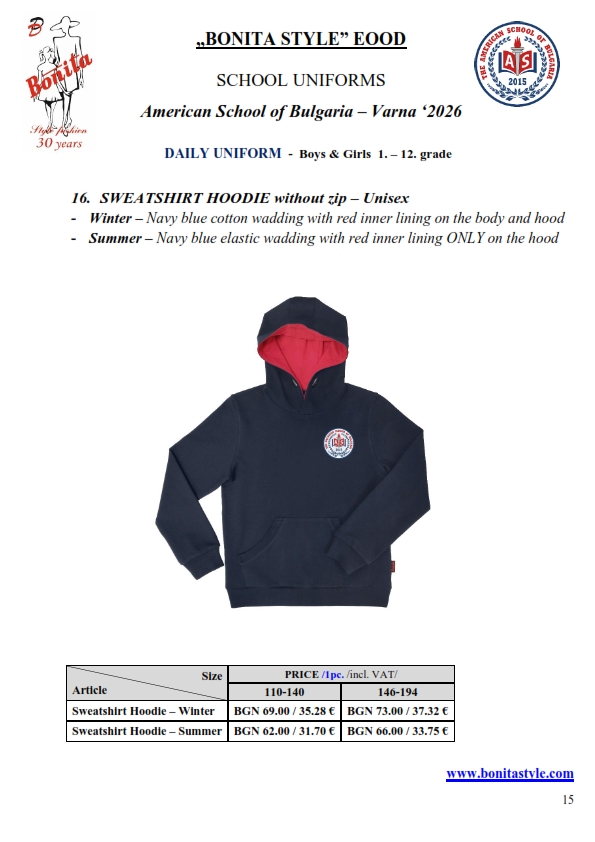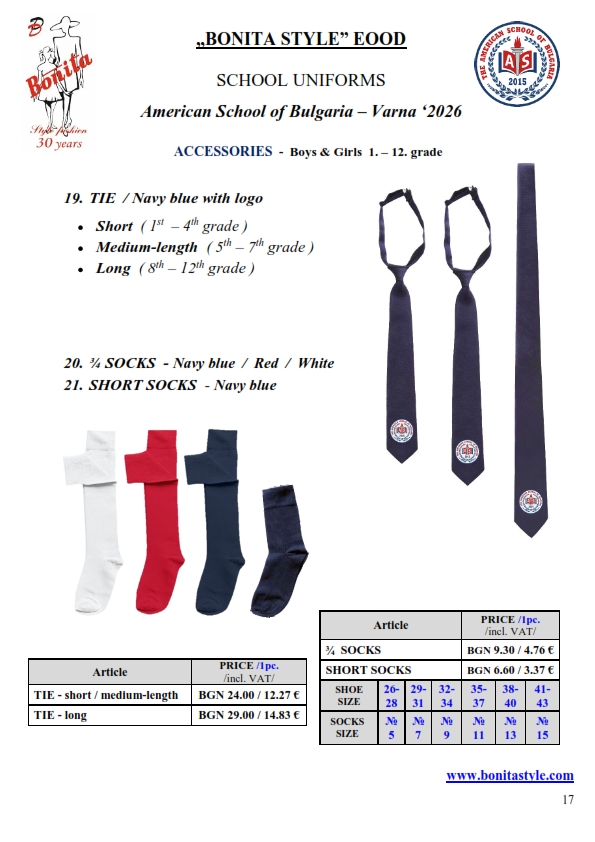 7. Гаранционни условия: “БОНИТА СТИЛ” е сертифицирана и прилага система за управление на качеството ISO 9001:2015. В съответствие с изискванията на тази система и прилаганите процедури, "БОНИТА СТИЛ" гарантира, че всички произведени от фирмата продукти отговарят на изискванията на БДС и Европейските стандарти за безопасност и качество на стоките и услугите. Всички предлагани тук артикули за ученически униформи са с гаранционен срок в рамките на шест месеца. Действието на тази гаранция се простира върху всички използвани материали при установени фабрични дефекти, както и върху качеството на изработка на артикулите, при спазени всички предписани от производителя изисквания по отношение на третиране и съхранение на облеклата. Гаранцията не отнася за механични и химични увреждания на тъканите, причинени от Клиента при употреба и третиране.