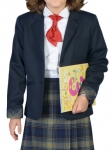 Елегантно тъмносиньо сако с подплата за момичета 1-4 клас, полувтален силует; Гарнитура от каре на ръкавите, с възможност за удължаване; Закопчаване с две копчета