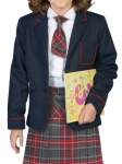 Елегантно тъмносиньо сако с подплата за момичета 1-4 клас, полувтален силует; С червени декоративни кантове; С възможност за удължаване на ръкавите; Закопчаване с две копчета