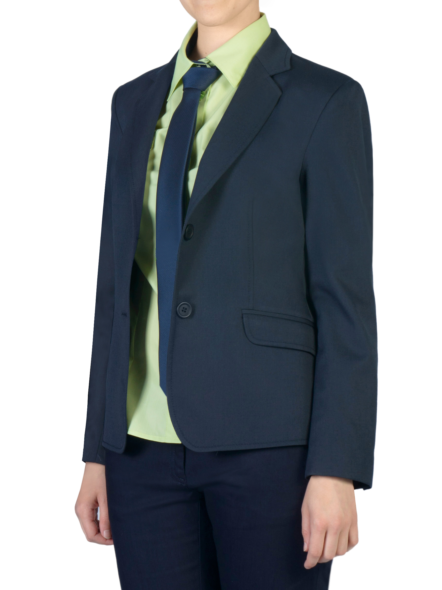 Елегантно тъмносиньо сако с подплата за момичета 5-12 клас, втален силует; С един шлиц на гърба; Закопчаване с две копчета